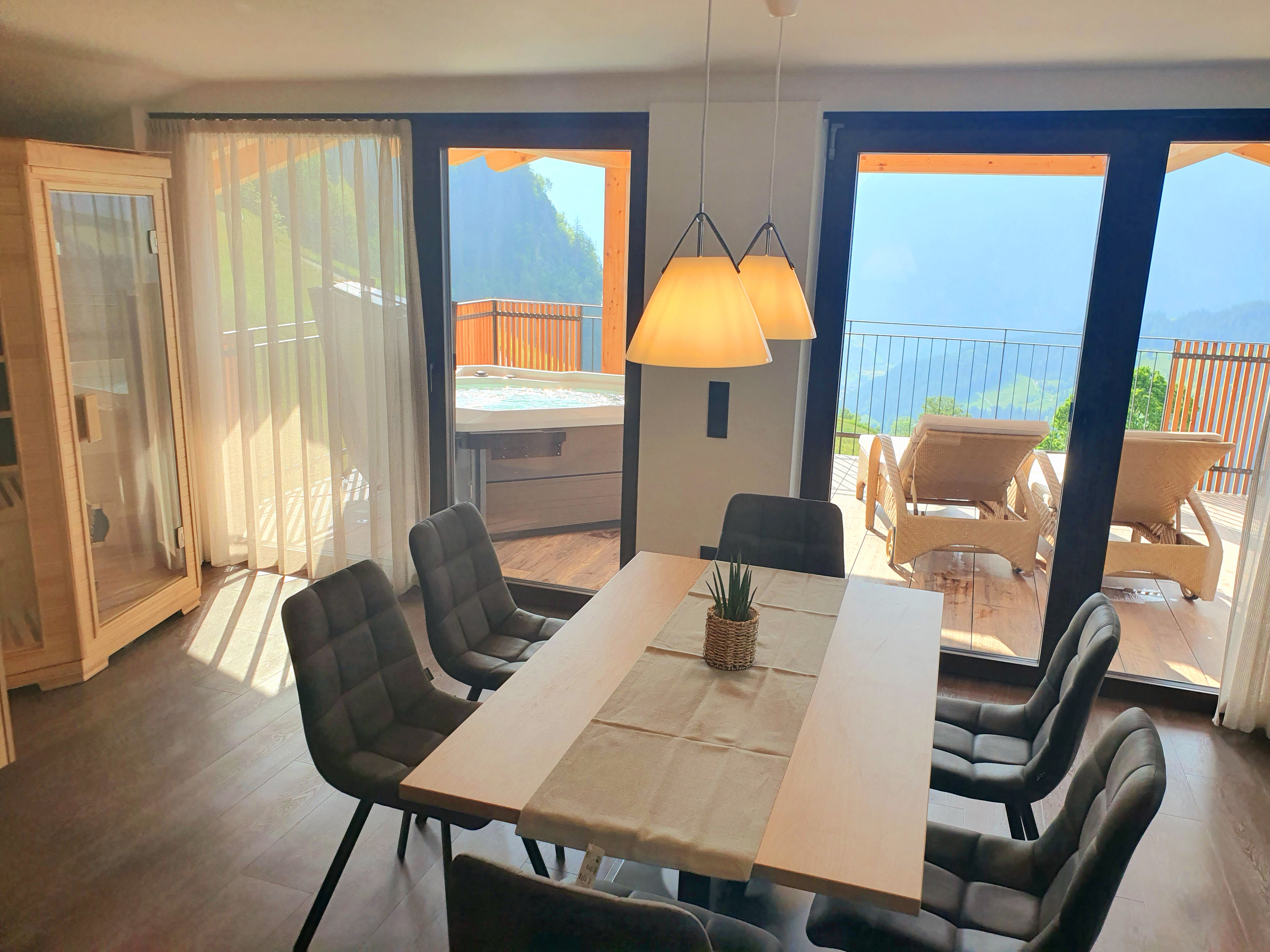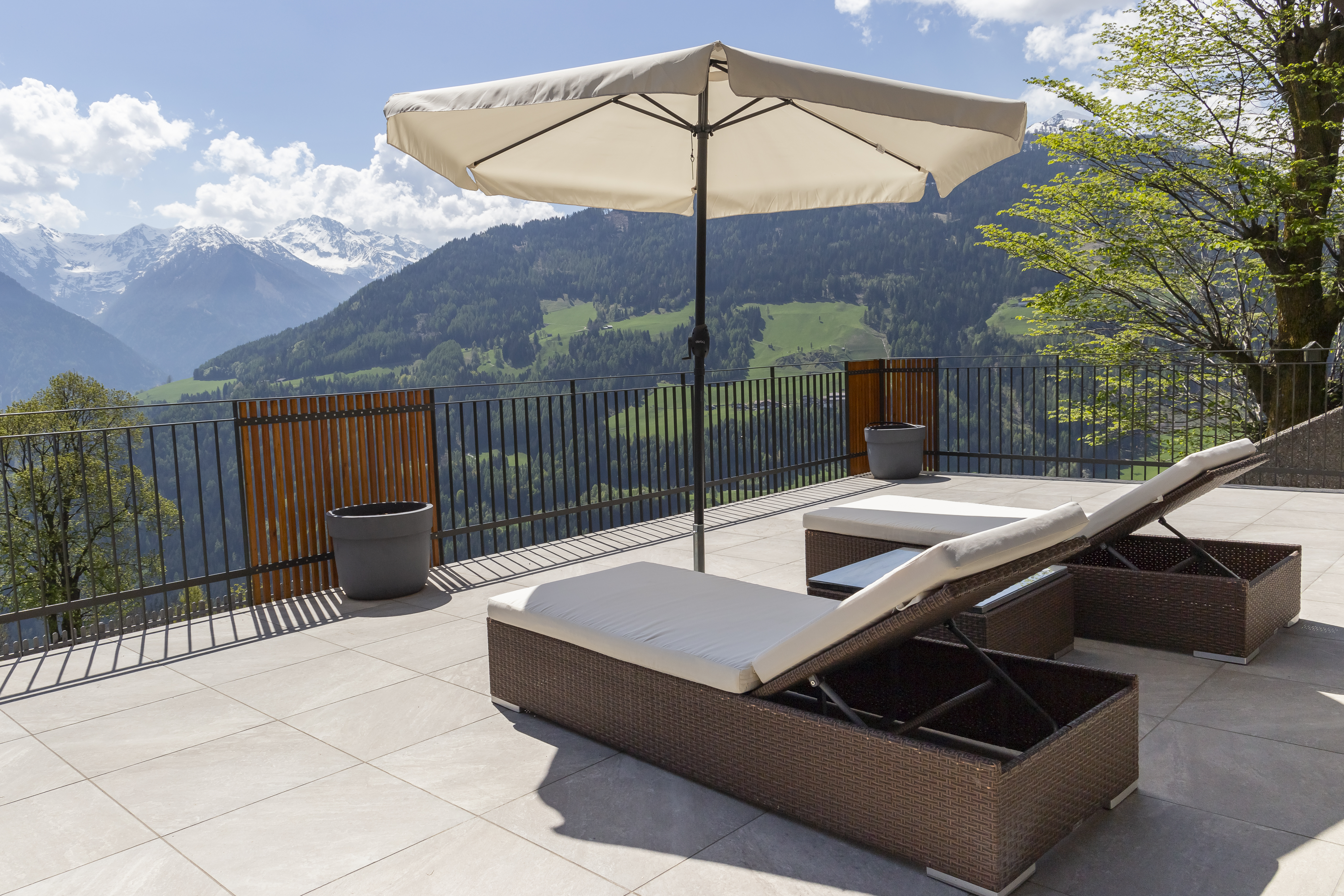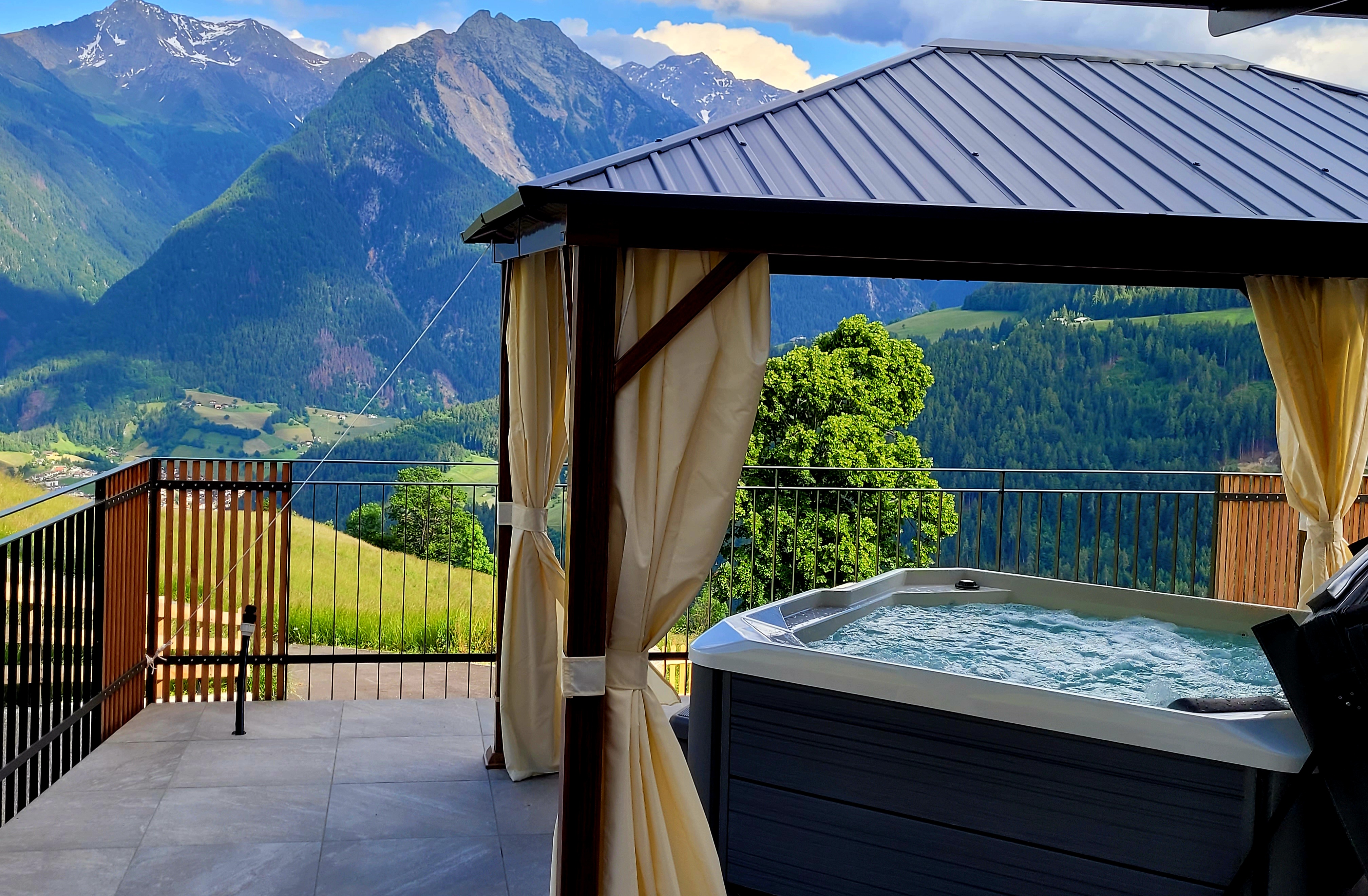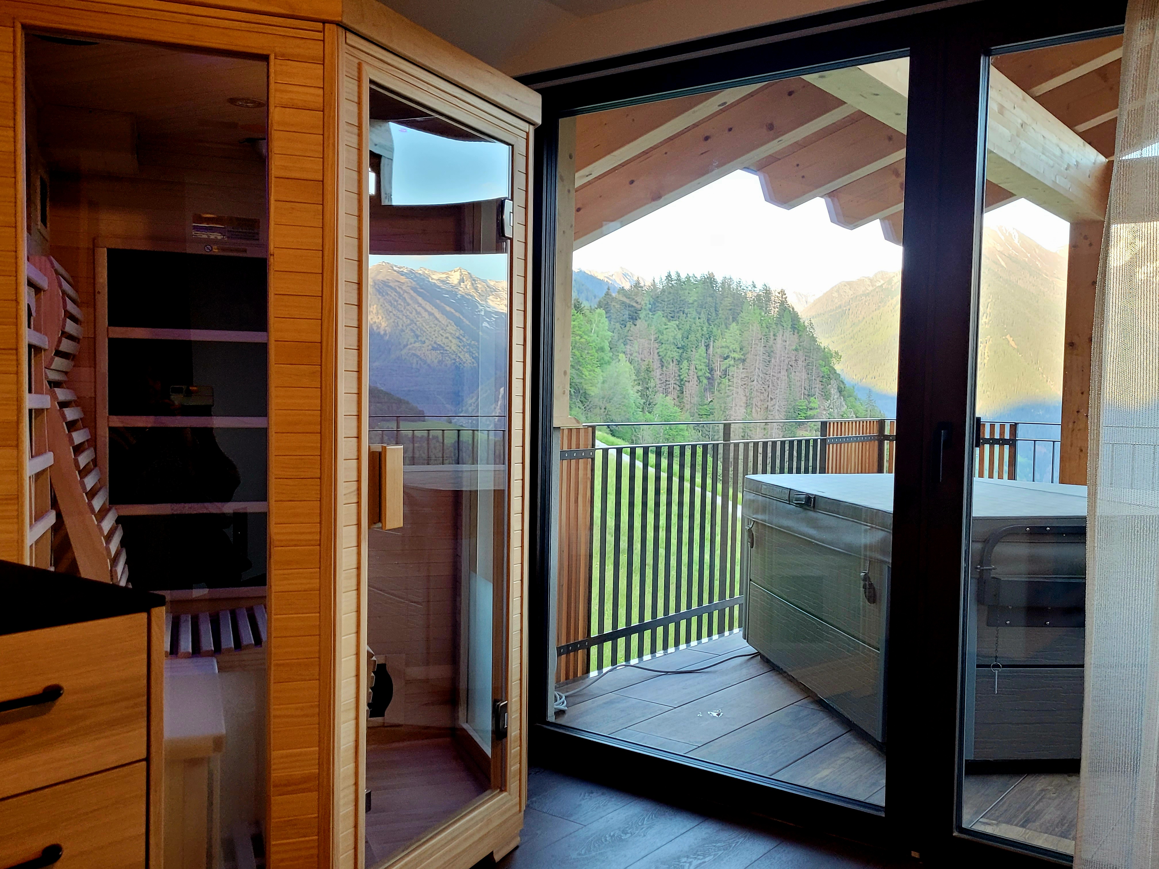 Das Highlight des Apartments „Exclusive Panorama“ ist der excluviser Whirlpool auf der 80qm großen Terrasse mit atemberaubendem Blick auf die umliegenden Berge. Eine Infrarot-Sauna macht das Wellness-Erlebnis nach einem aktiven Tag in den Bergen perfekt.
