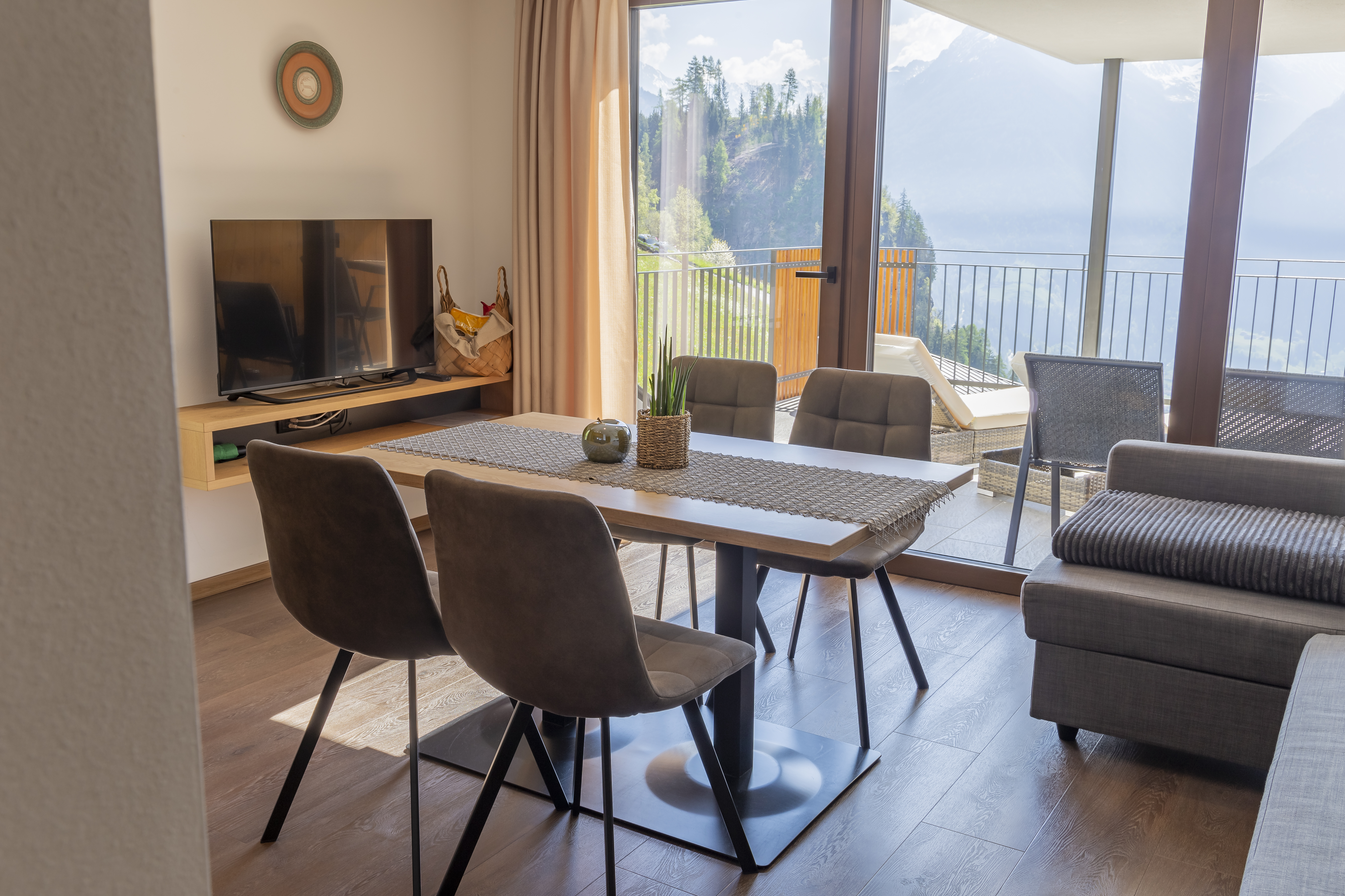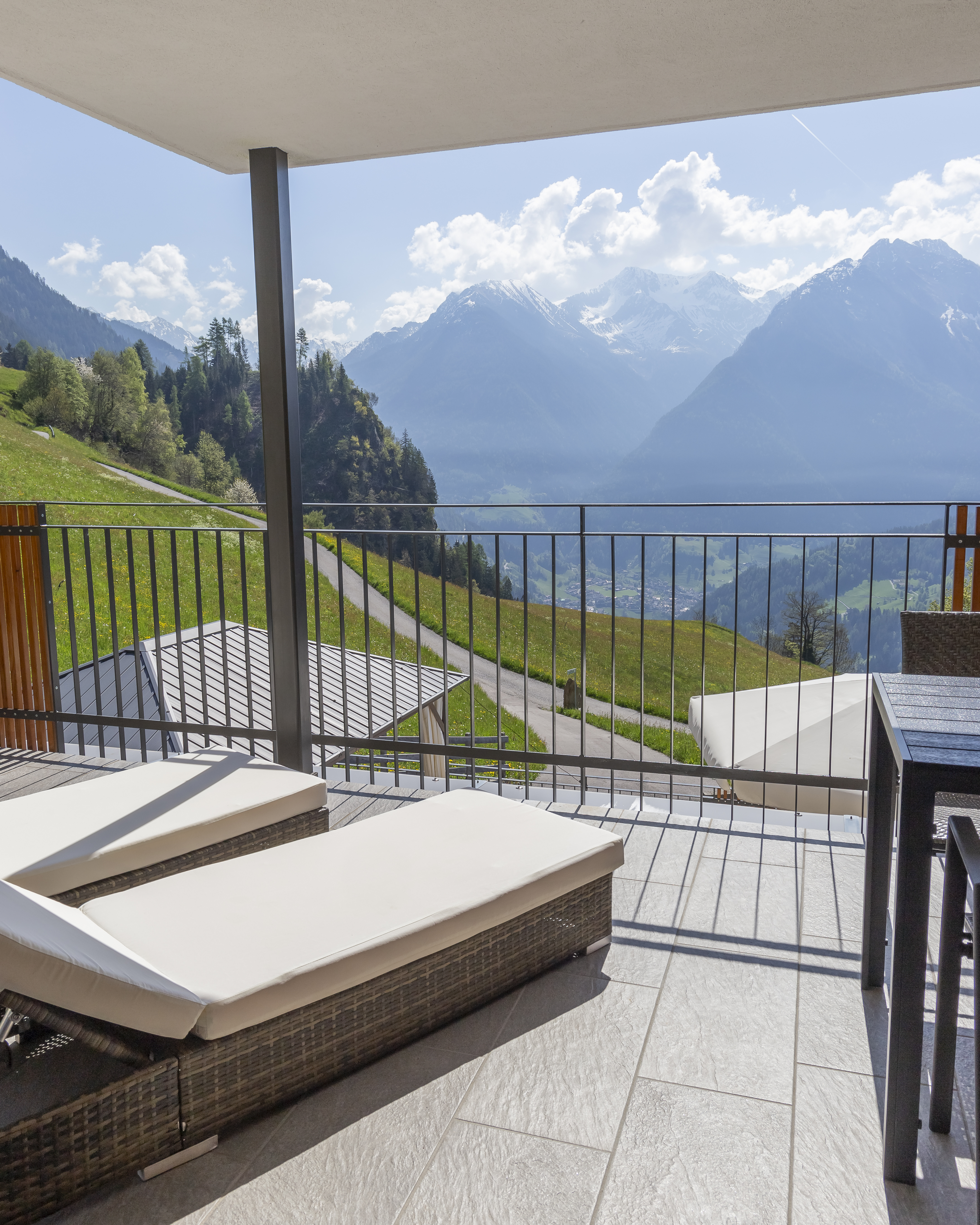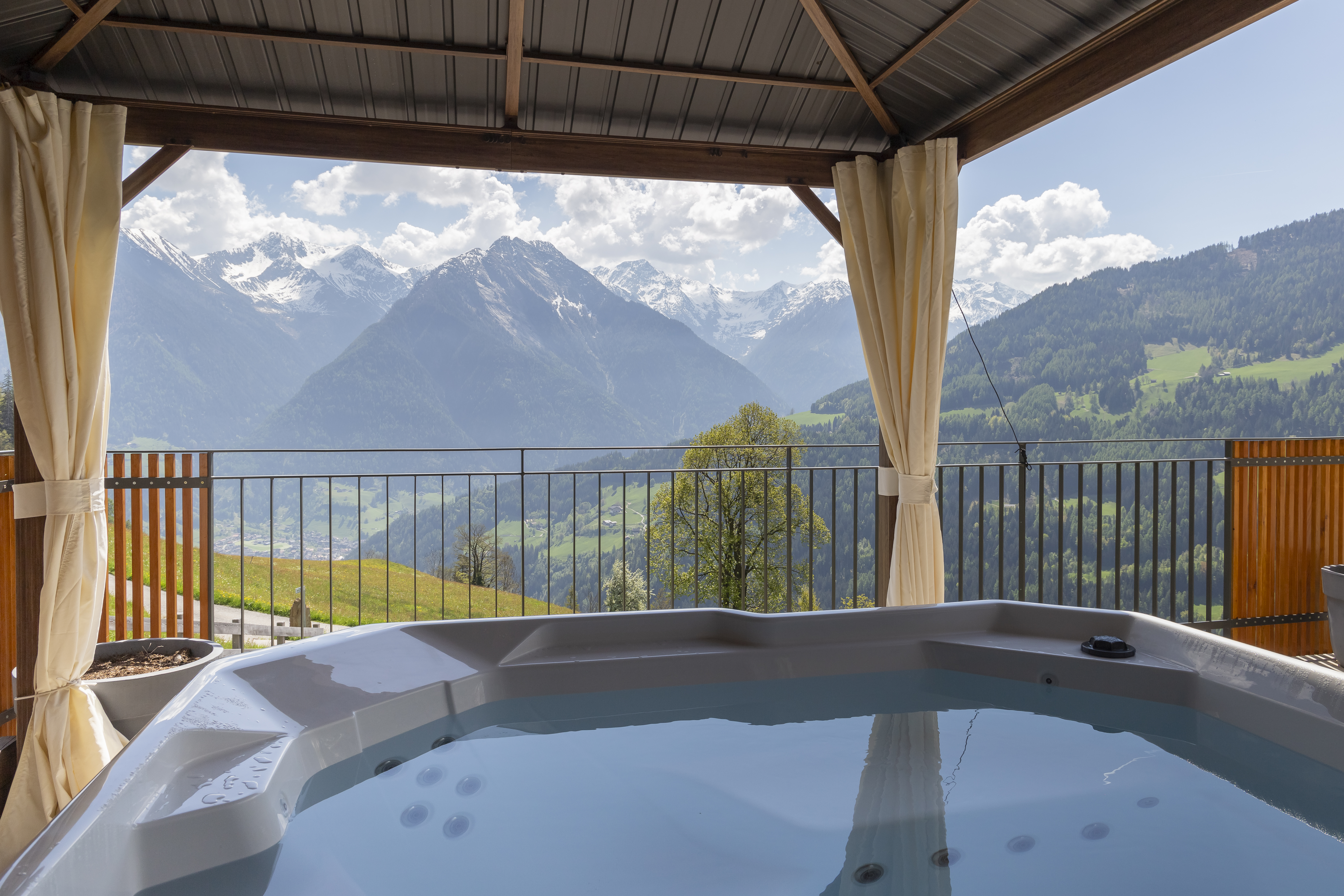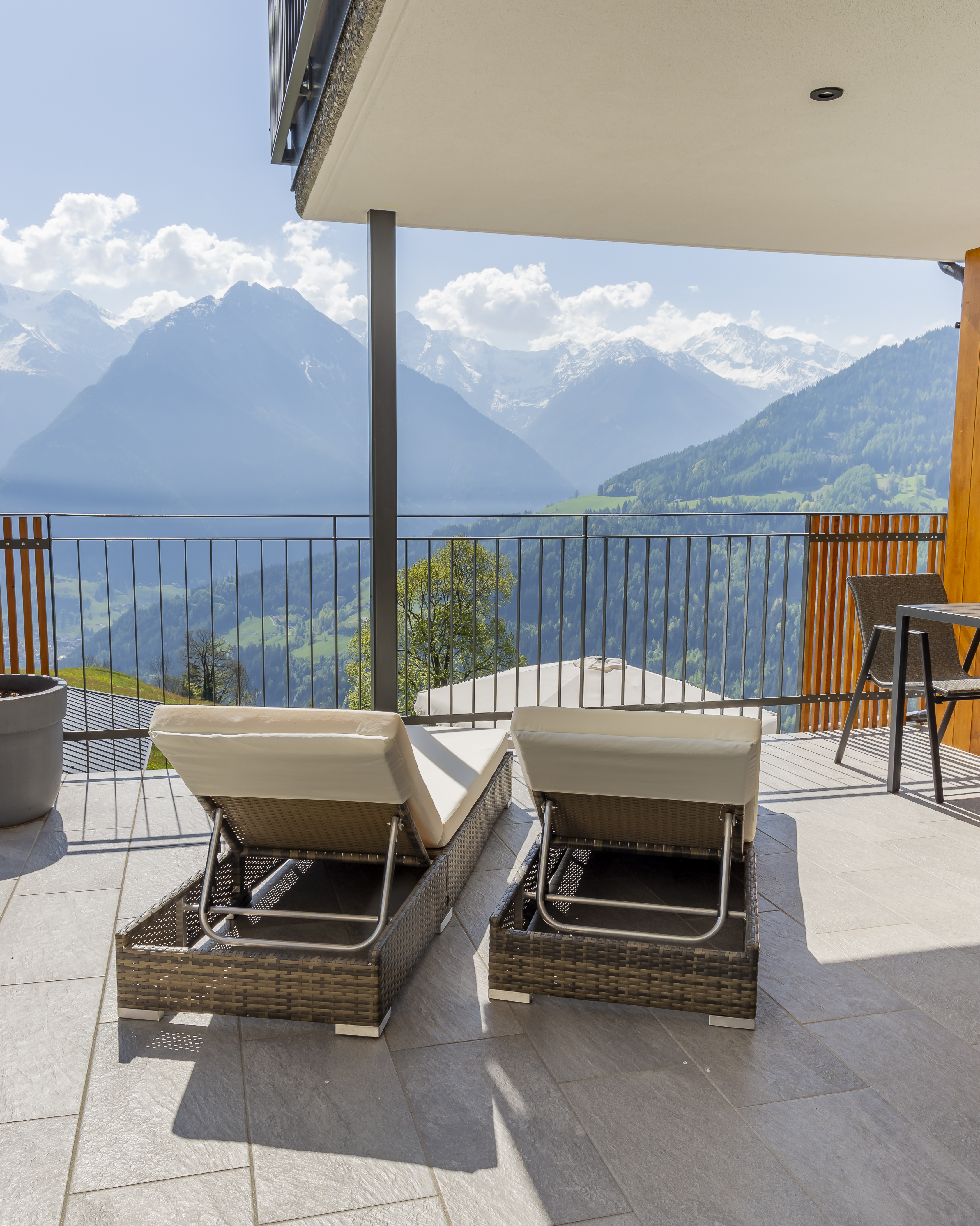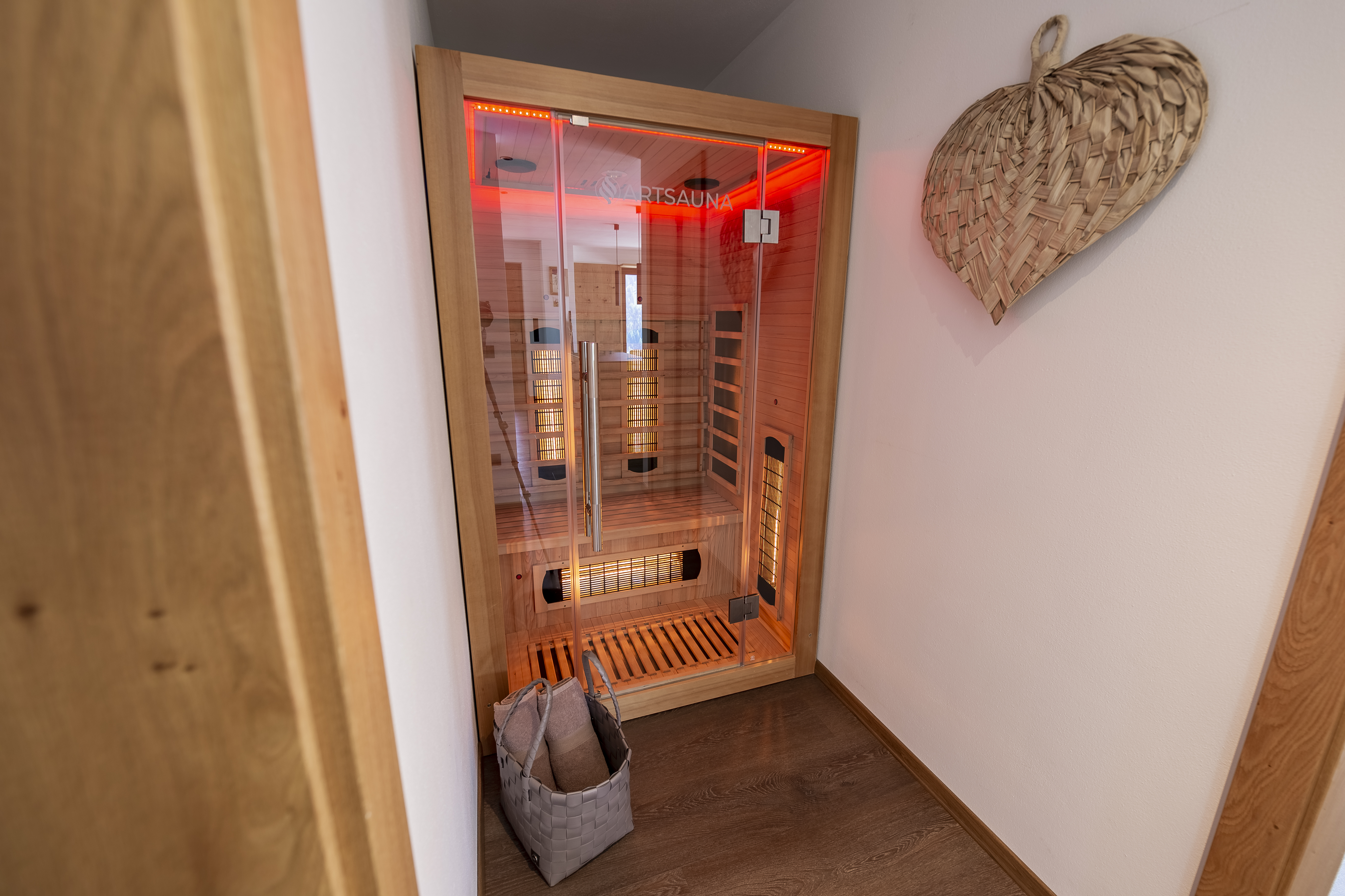 Das Highlight des Apartments „Exclusive Panorama“ ist der excluviser Whirlpool auf der 80qm großen Terrasse mit atemberaubendem Blick auf die umliegenden Berge. Eine Infrarot-Sauna macht das Wellness-Erlebnis nach einem aktiven Tag in den Bergen perfekt.