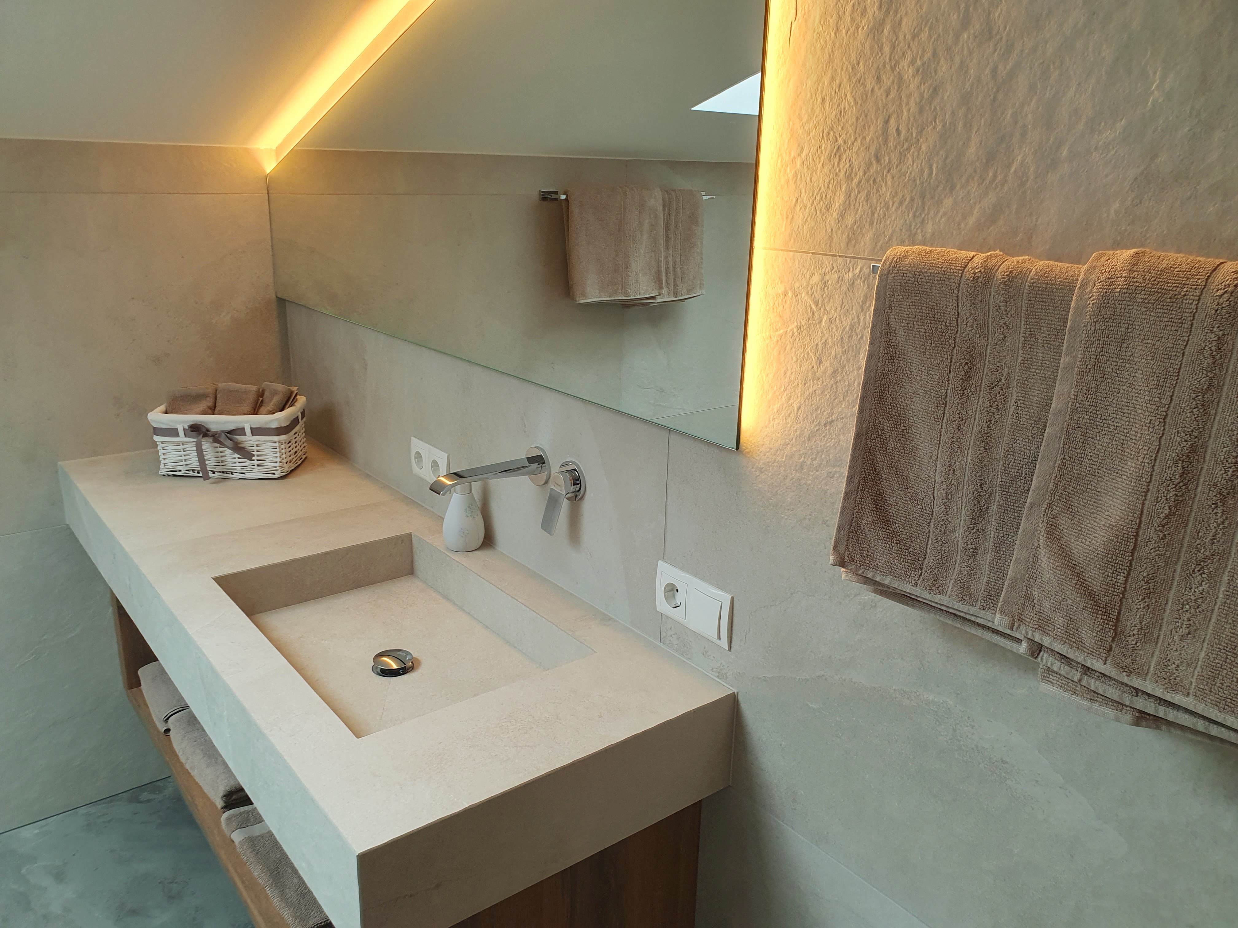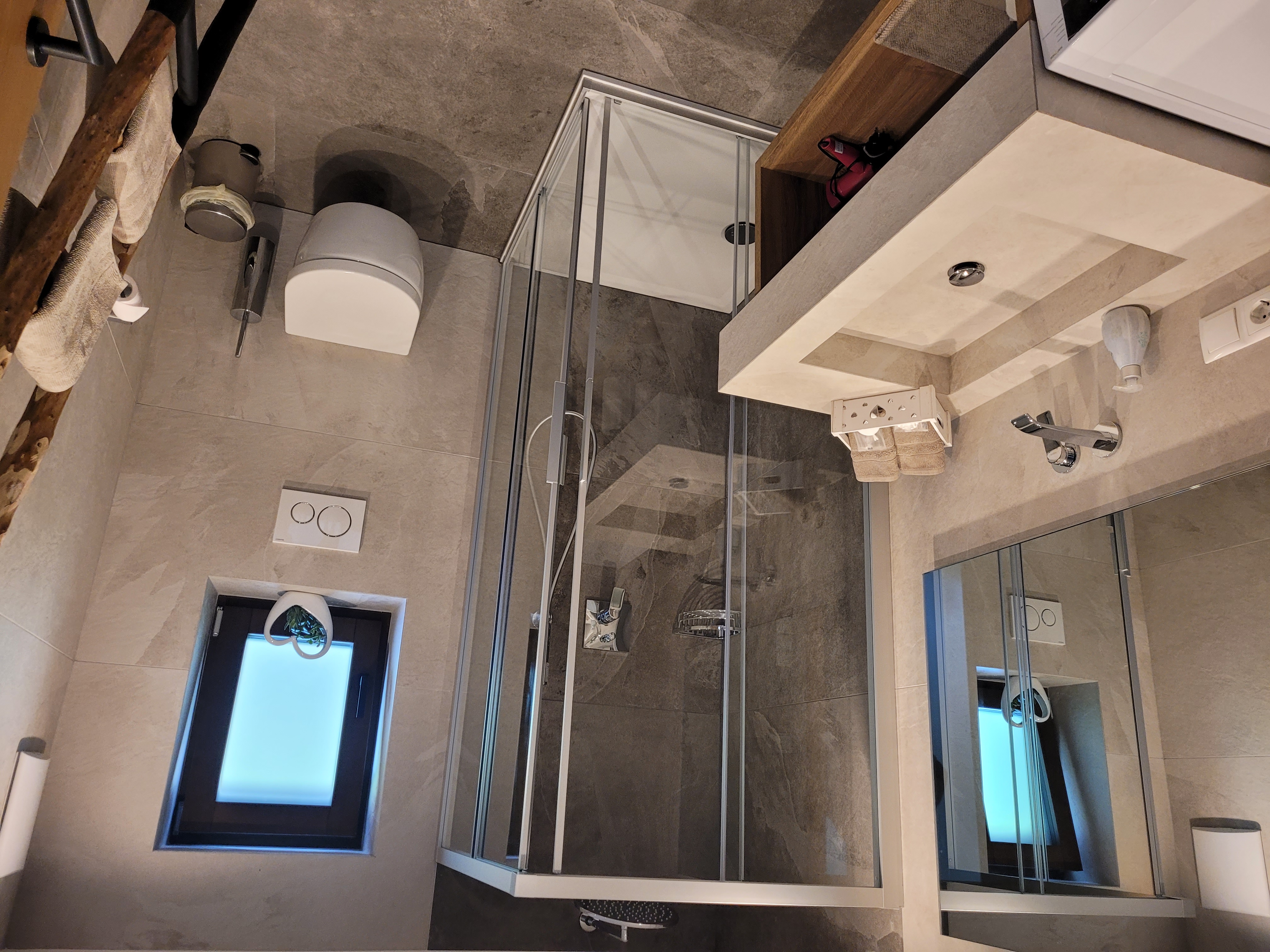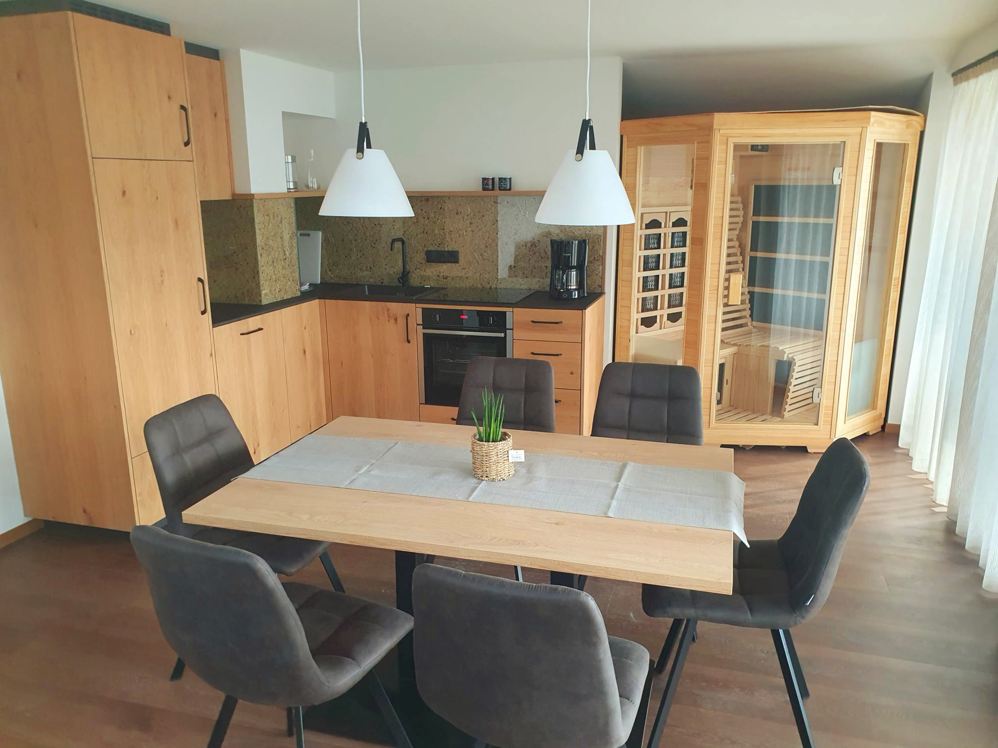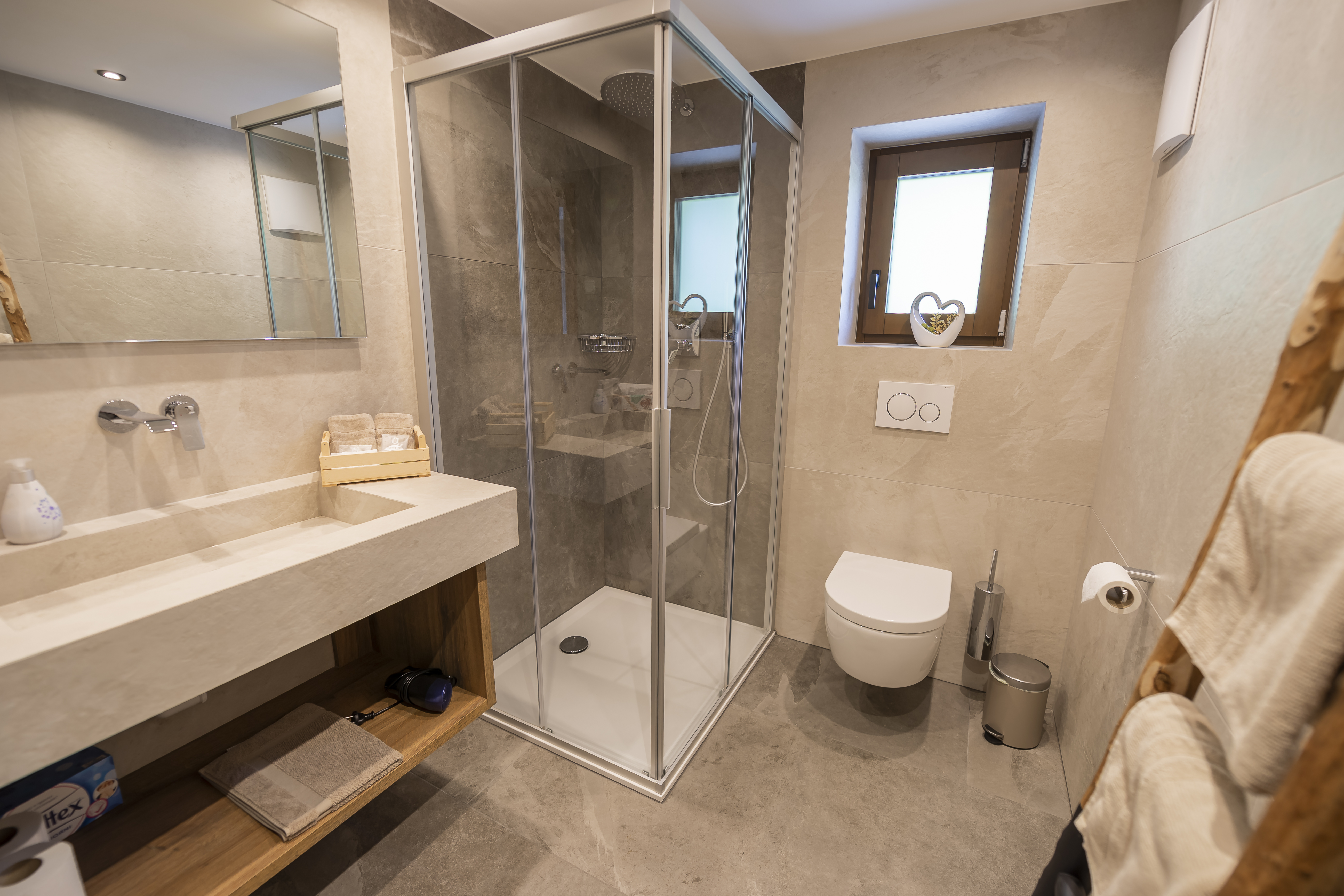 Das Highlight des Apartments „Exclusive Panorama“ ist der excluviser Whirlpool auf der 80qm großen Terrasse mit atemberaubendem Blick auf die umliegenden Berge. Eine Infrarot-Sauna macht das Wellness-Erlebnis nach einem aktiven Tag in den Bergen perfekt.
