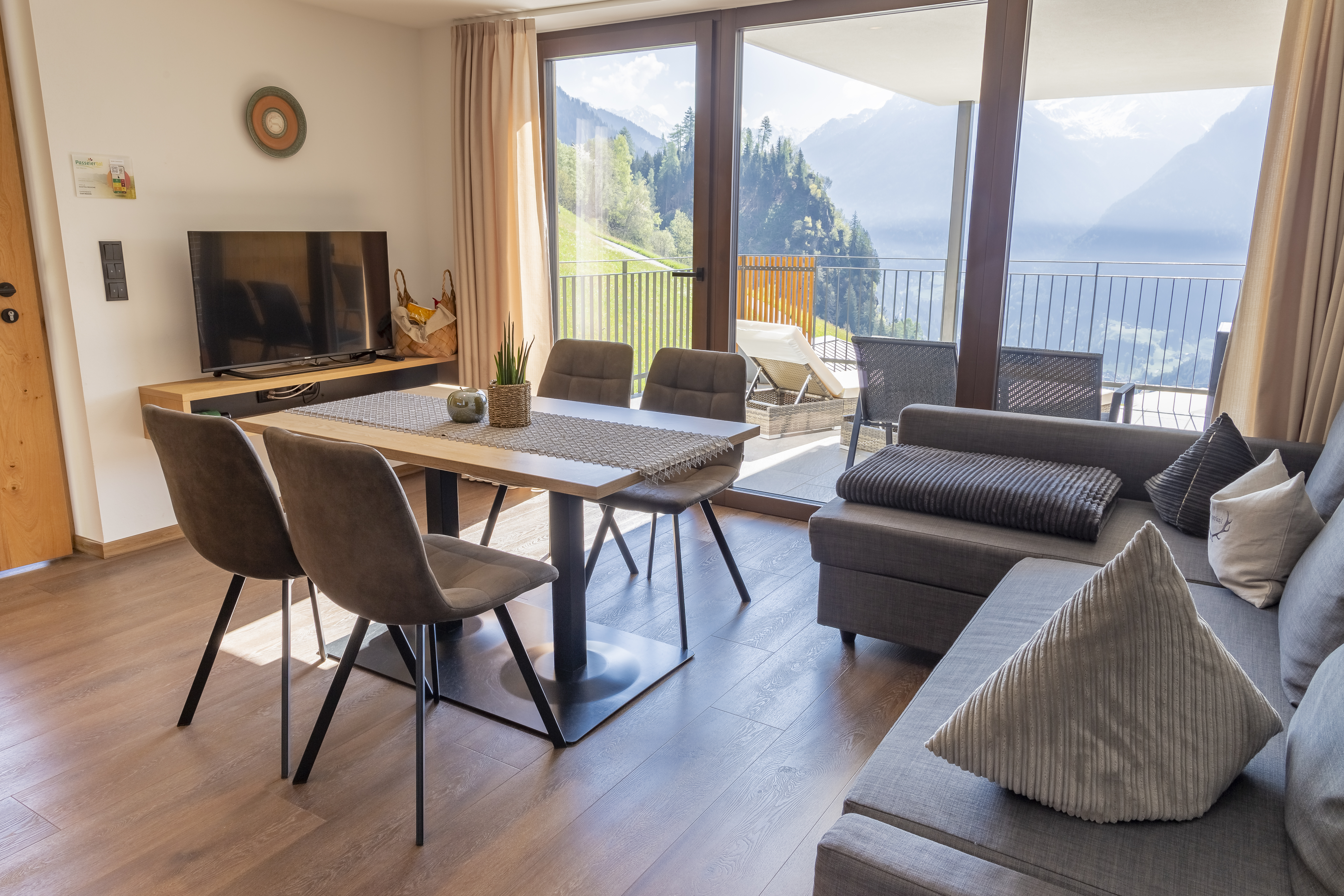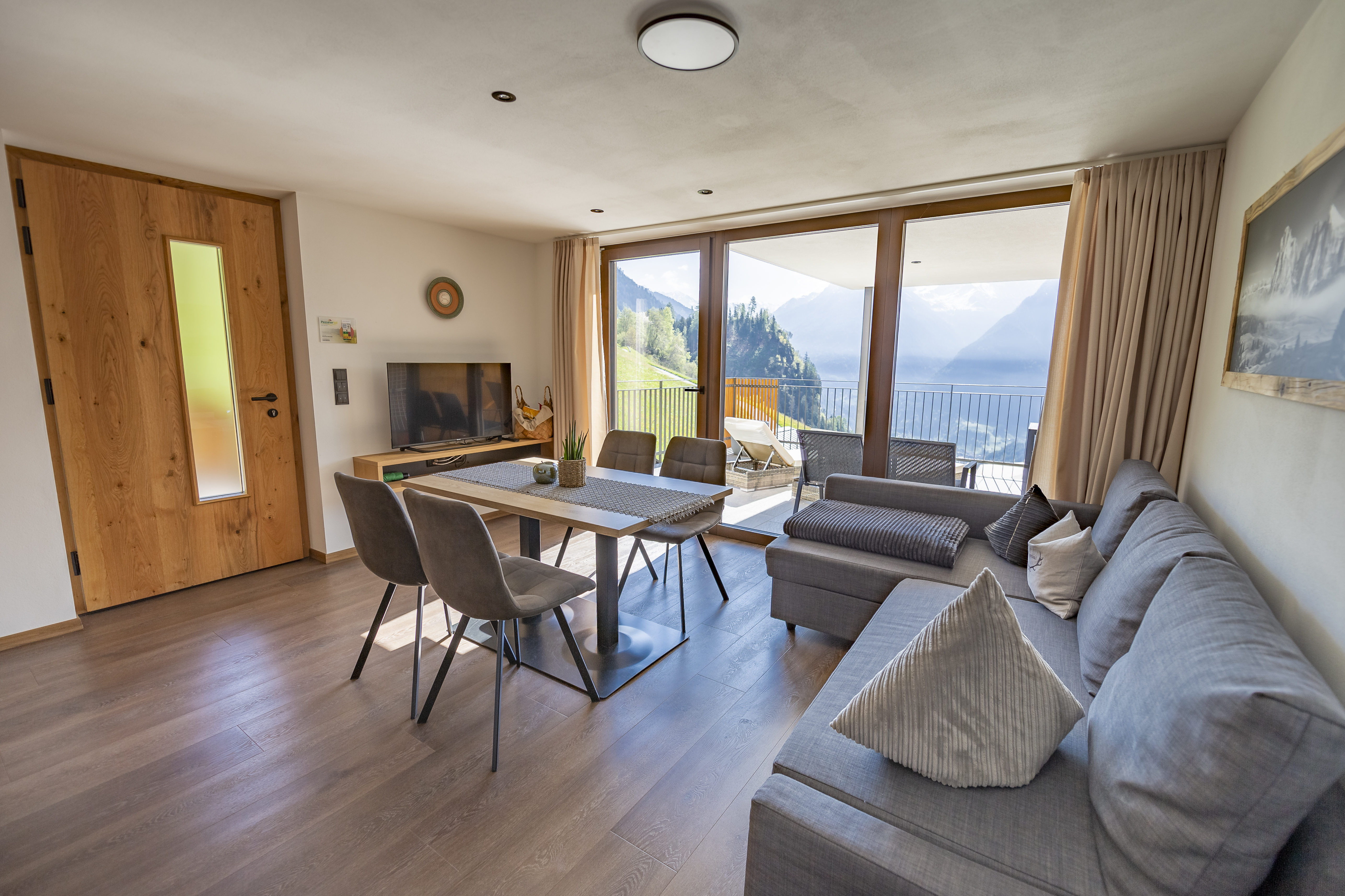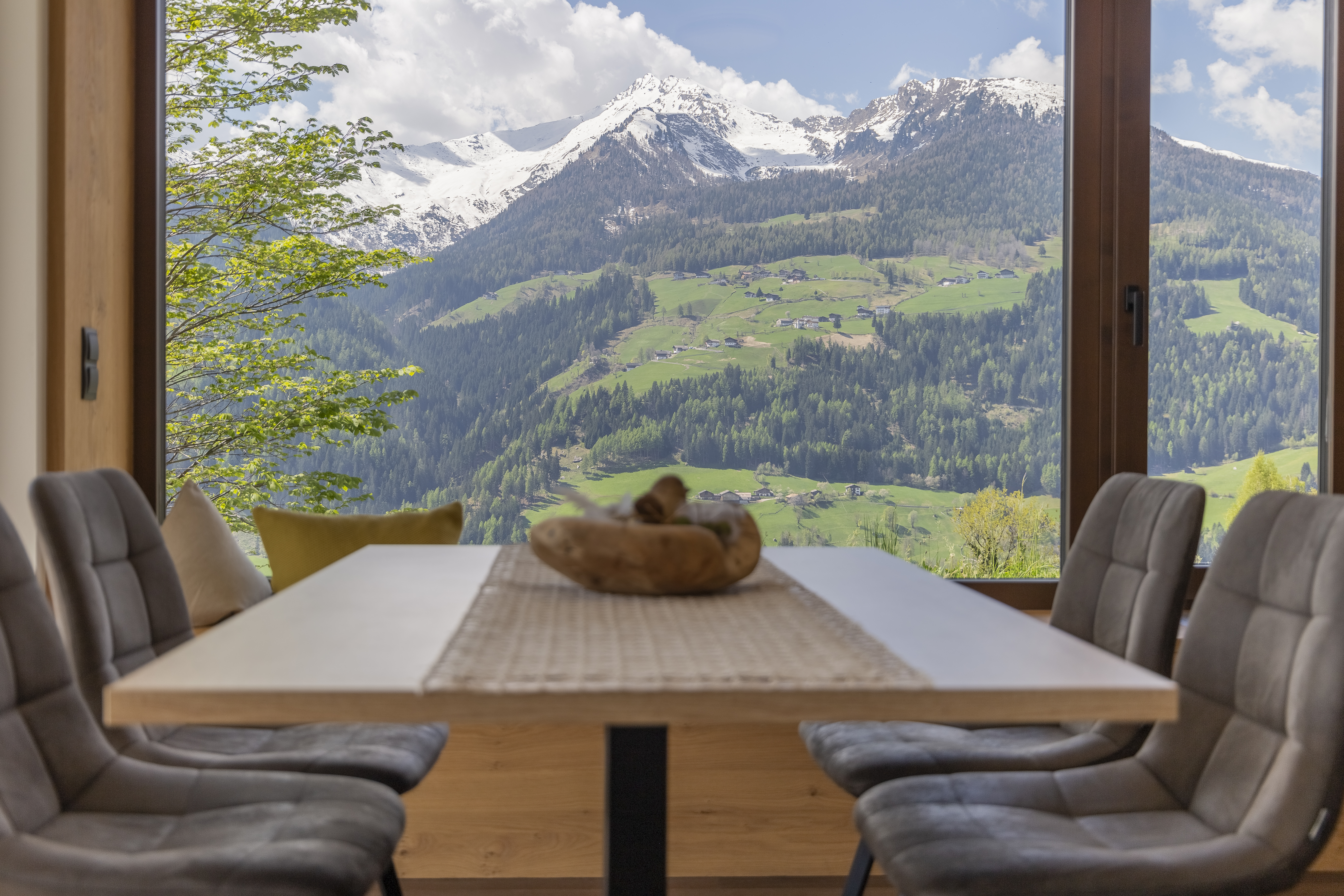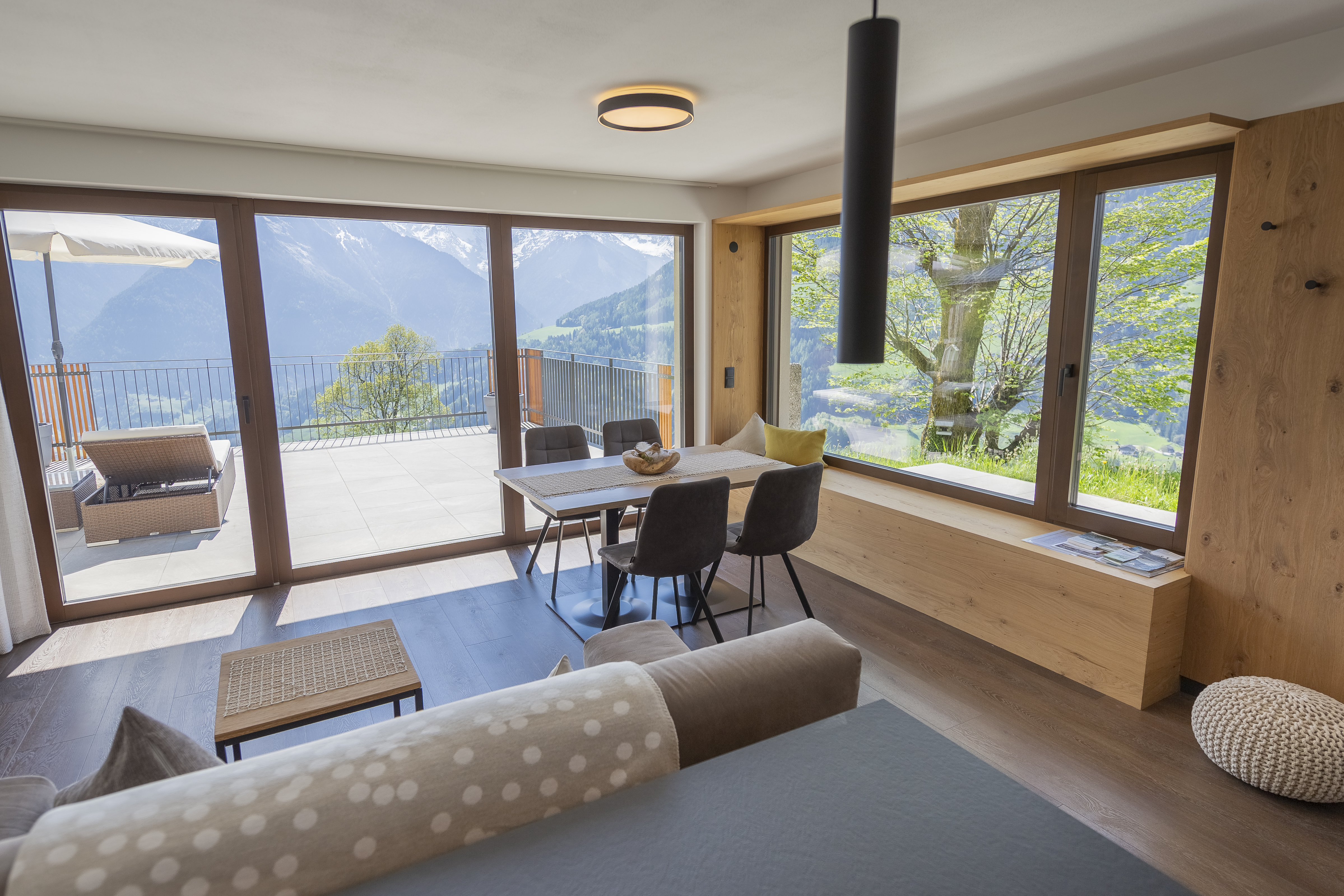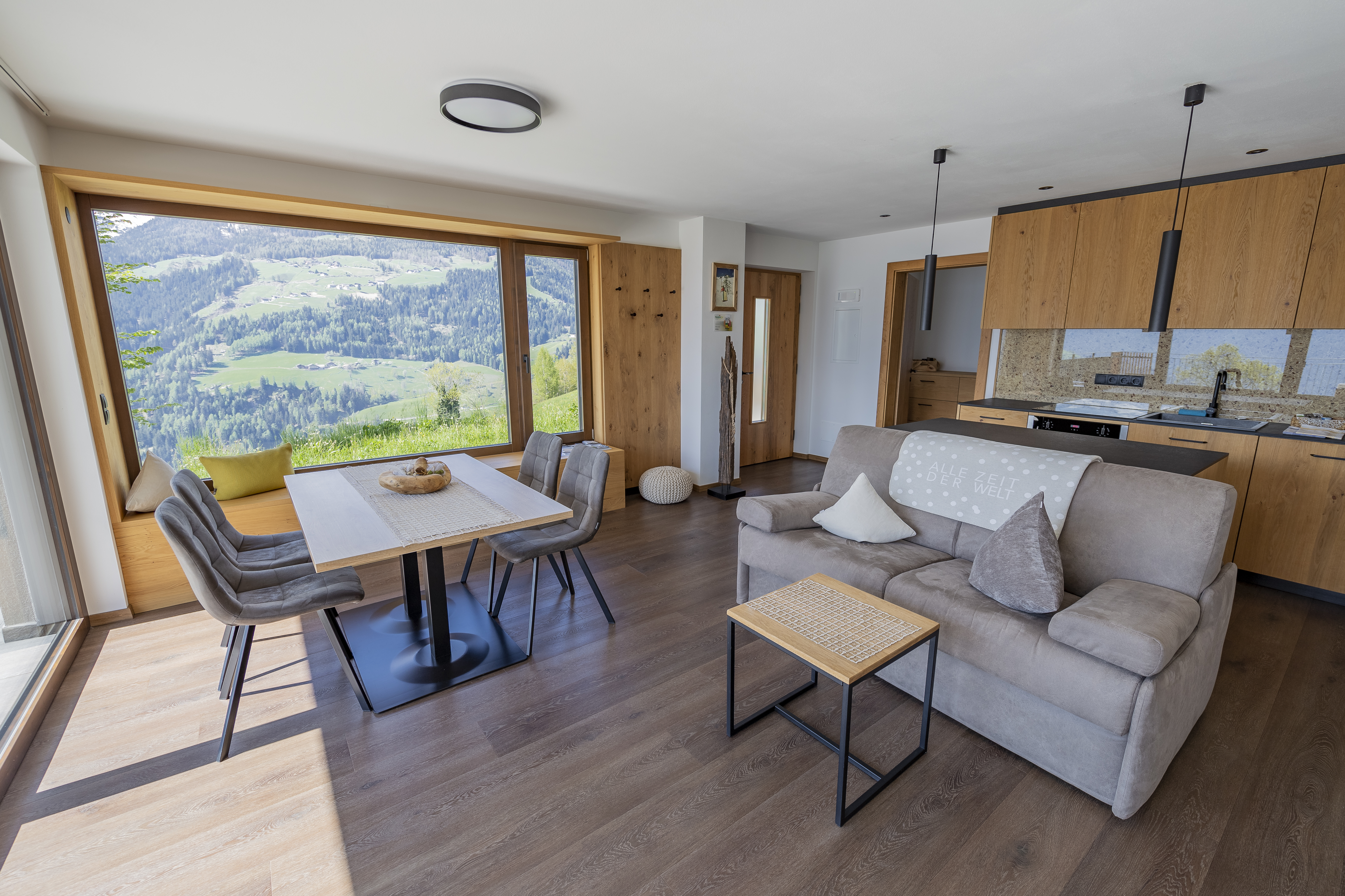 Die gesamte Wohnung ist mit Fußbodenheizung ausgestattet, das Haus ist als Klimahaus zertifiziert. Die Terrasse (17 qm) bietet einen atemberaubenden Ausblick auf die direkt angrenzenden Bergwiesen und das umliegende Alpenpanorama mit Plattenspitze (2345 m), Hochwart (2742 m) und Hirzer (2781 m).