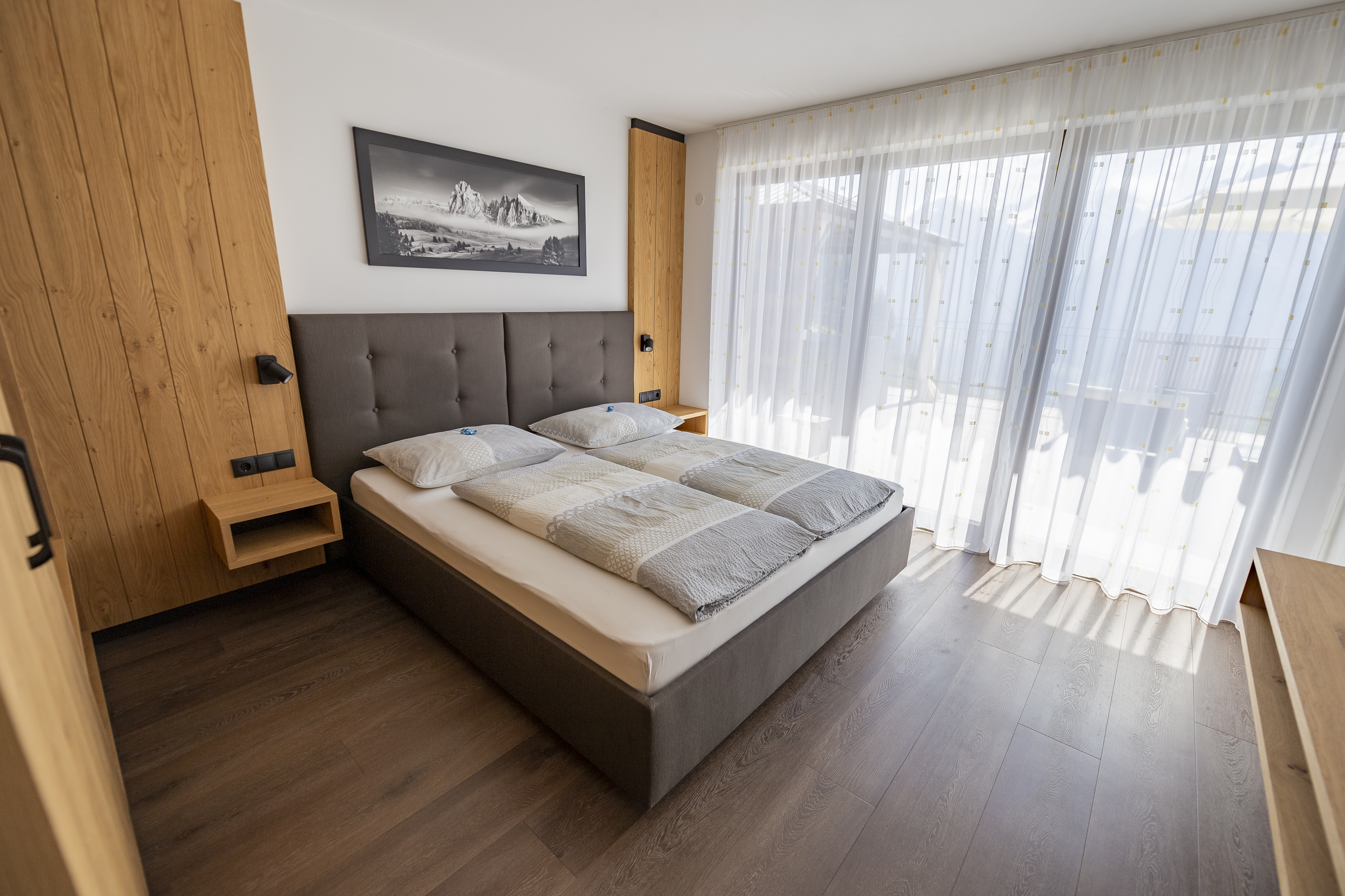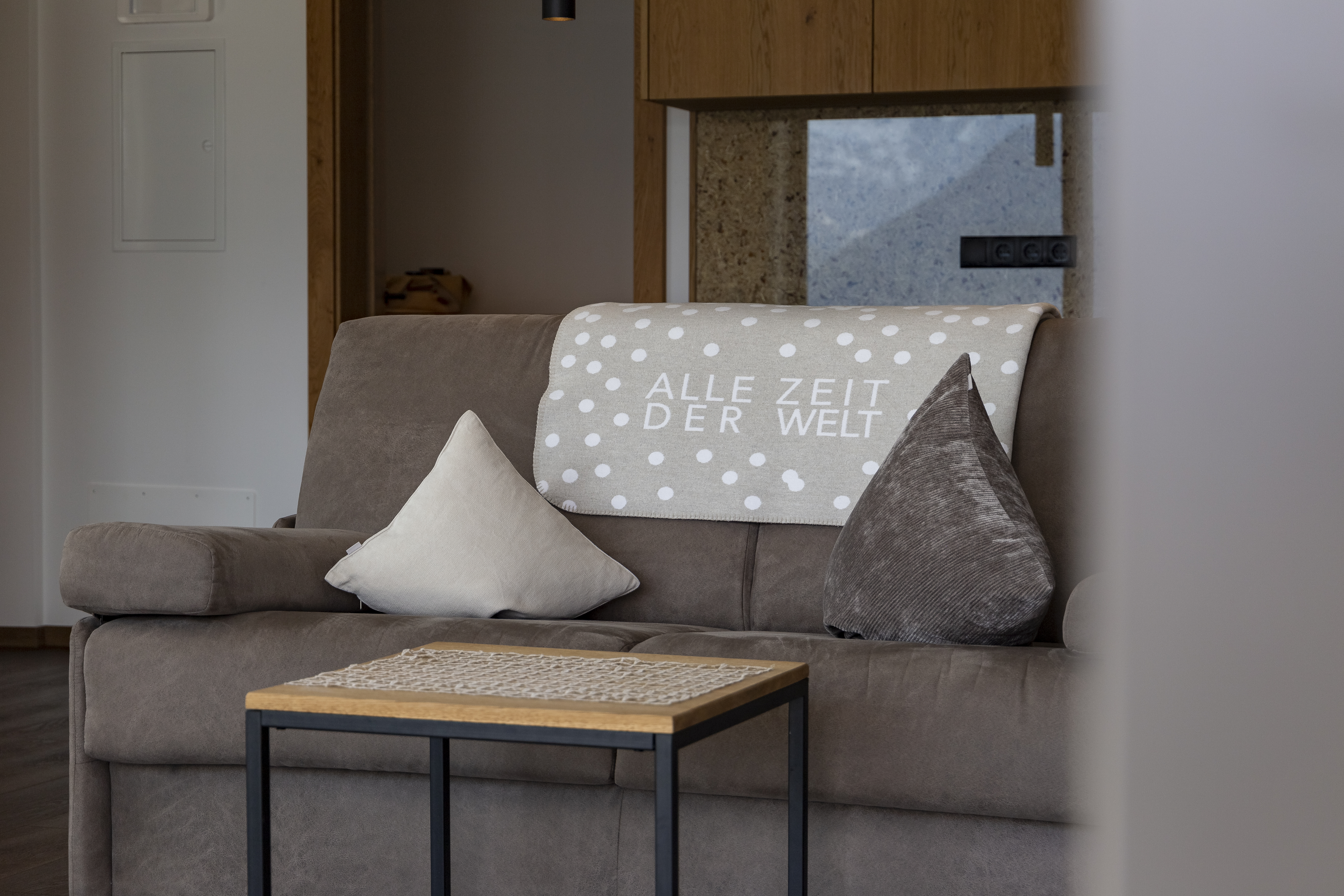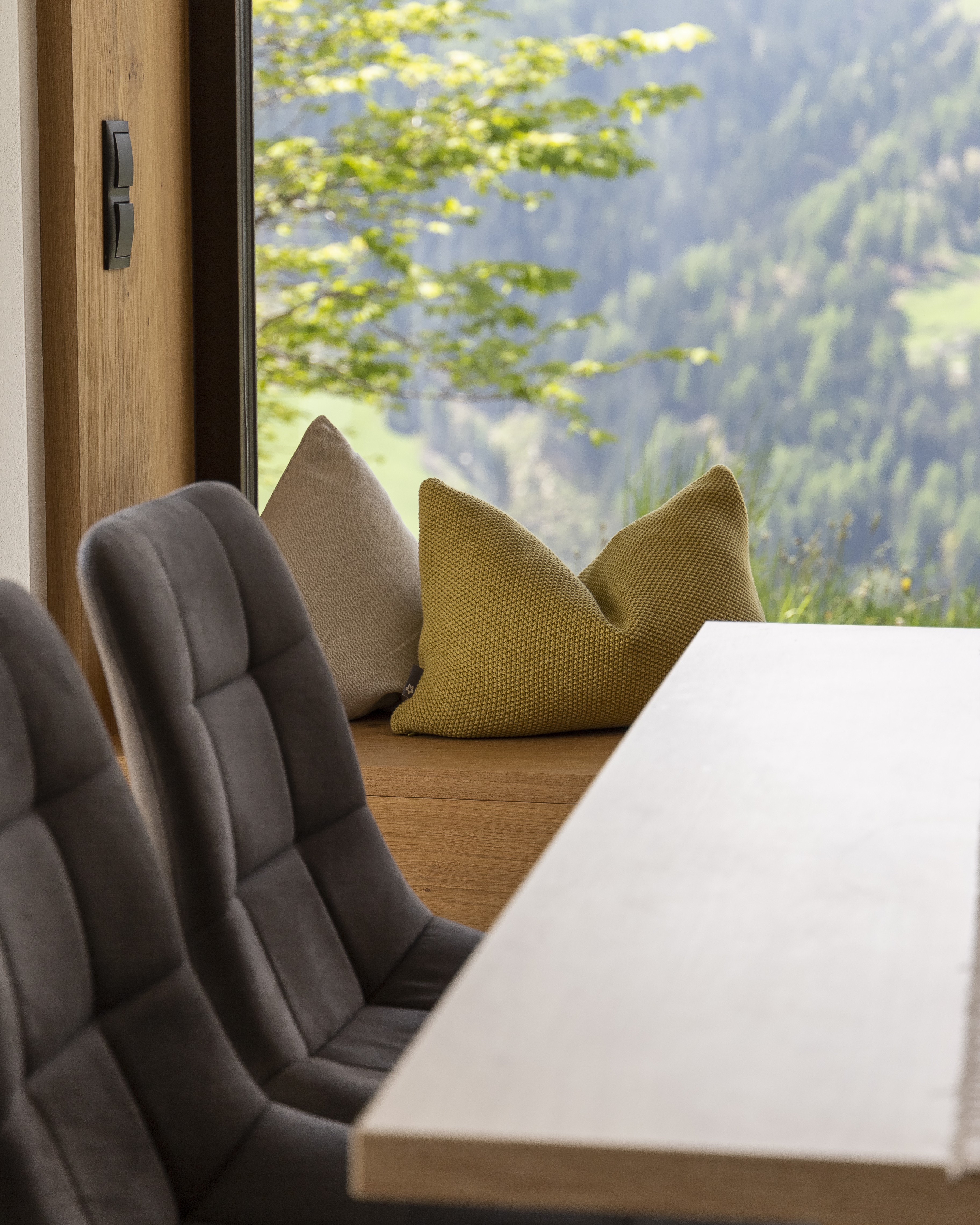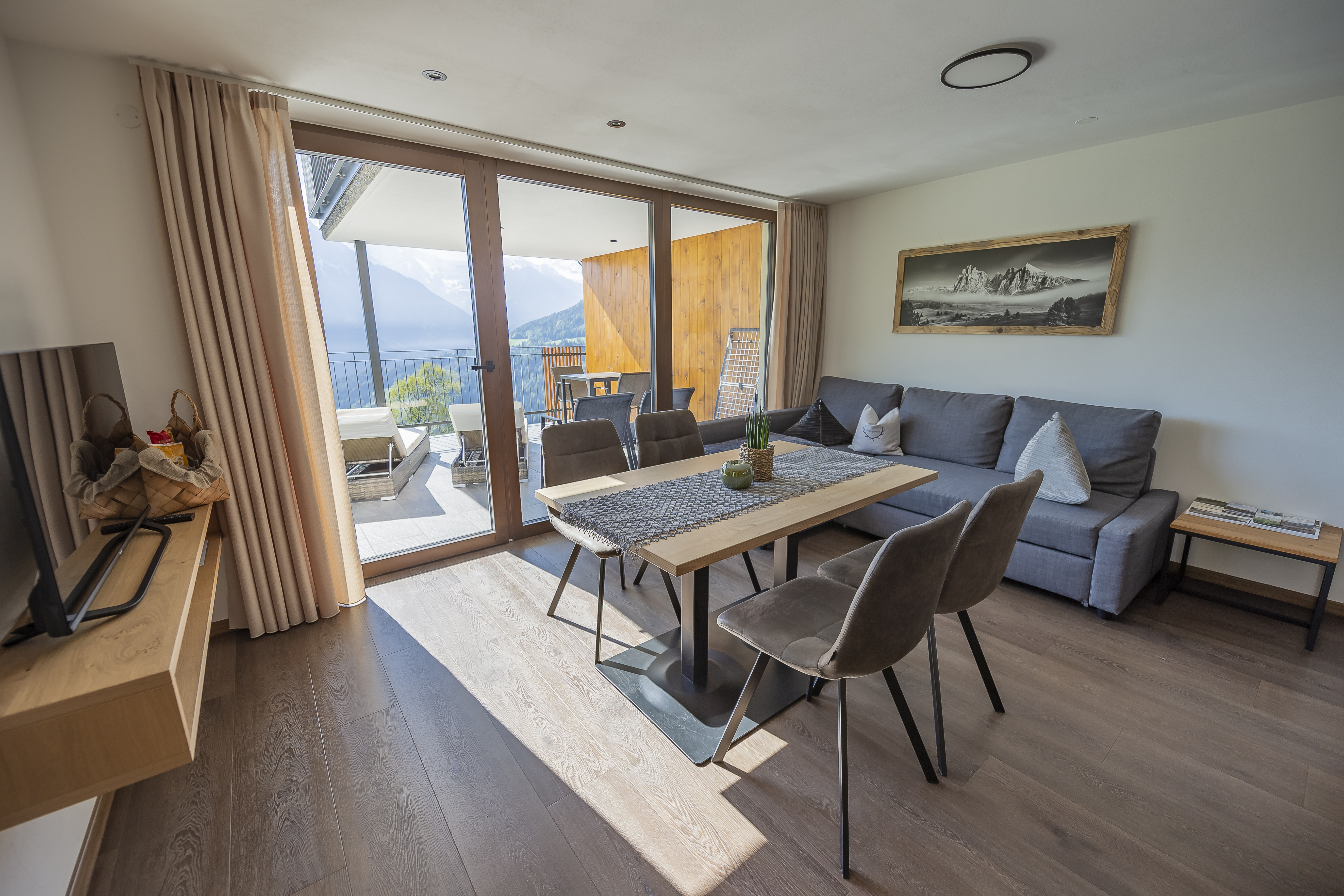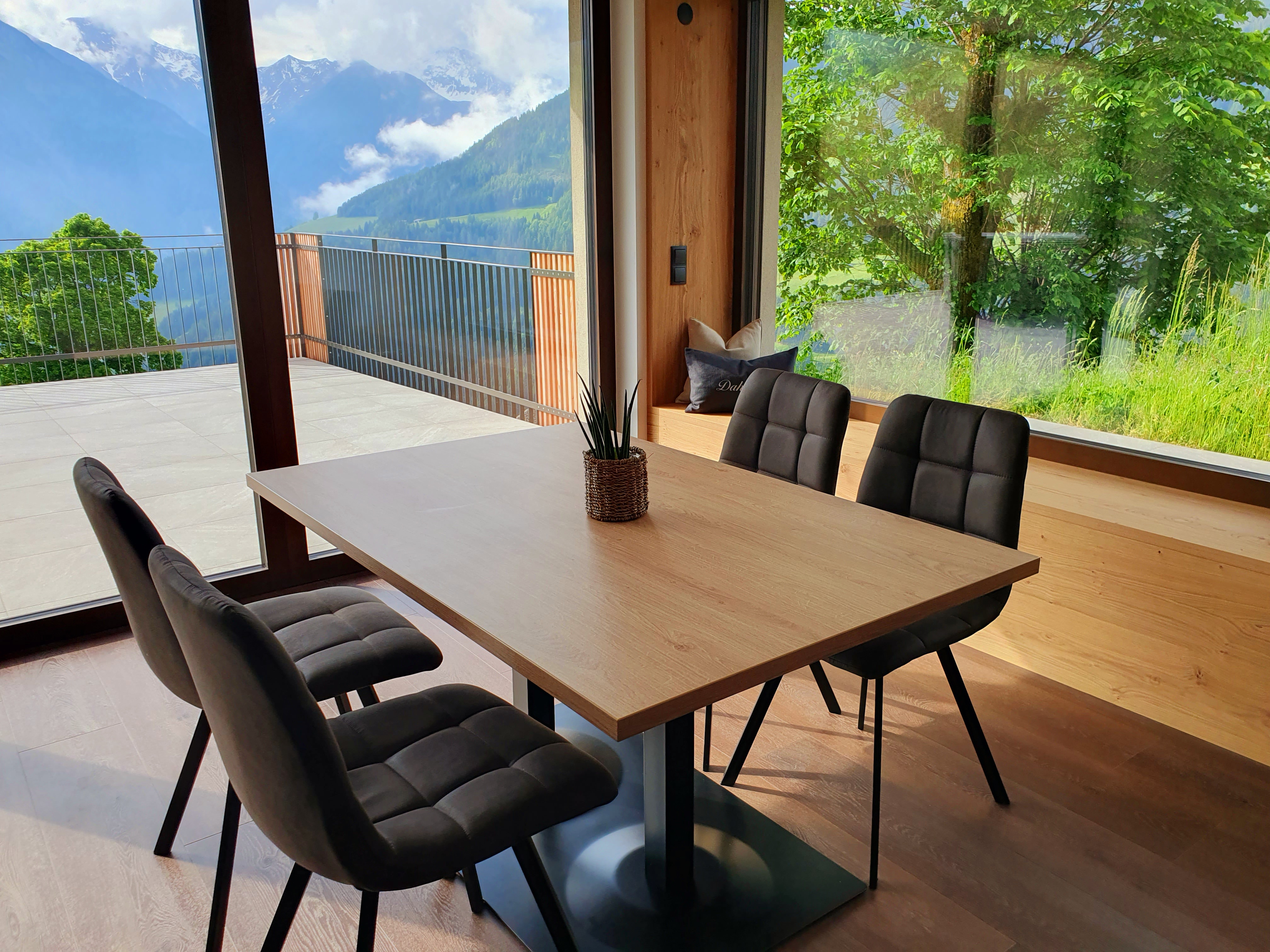 Die gesamte Wohnung ist mit Fußbodenheizung ausgestattet, das Haus ist als Klimahaus zertifiziert. Die Terrasse (17 qm) bietet einen atemberaubenden Ausblick auf die direkt angrenzenden Bergwiesen und das umliegende Alpenpanorama mit Plattenspitze (2345 m), Hochwart (2742 m) und Hirzer (2781 m).