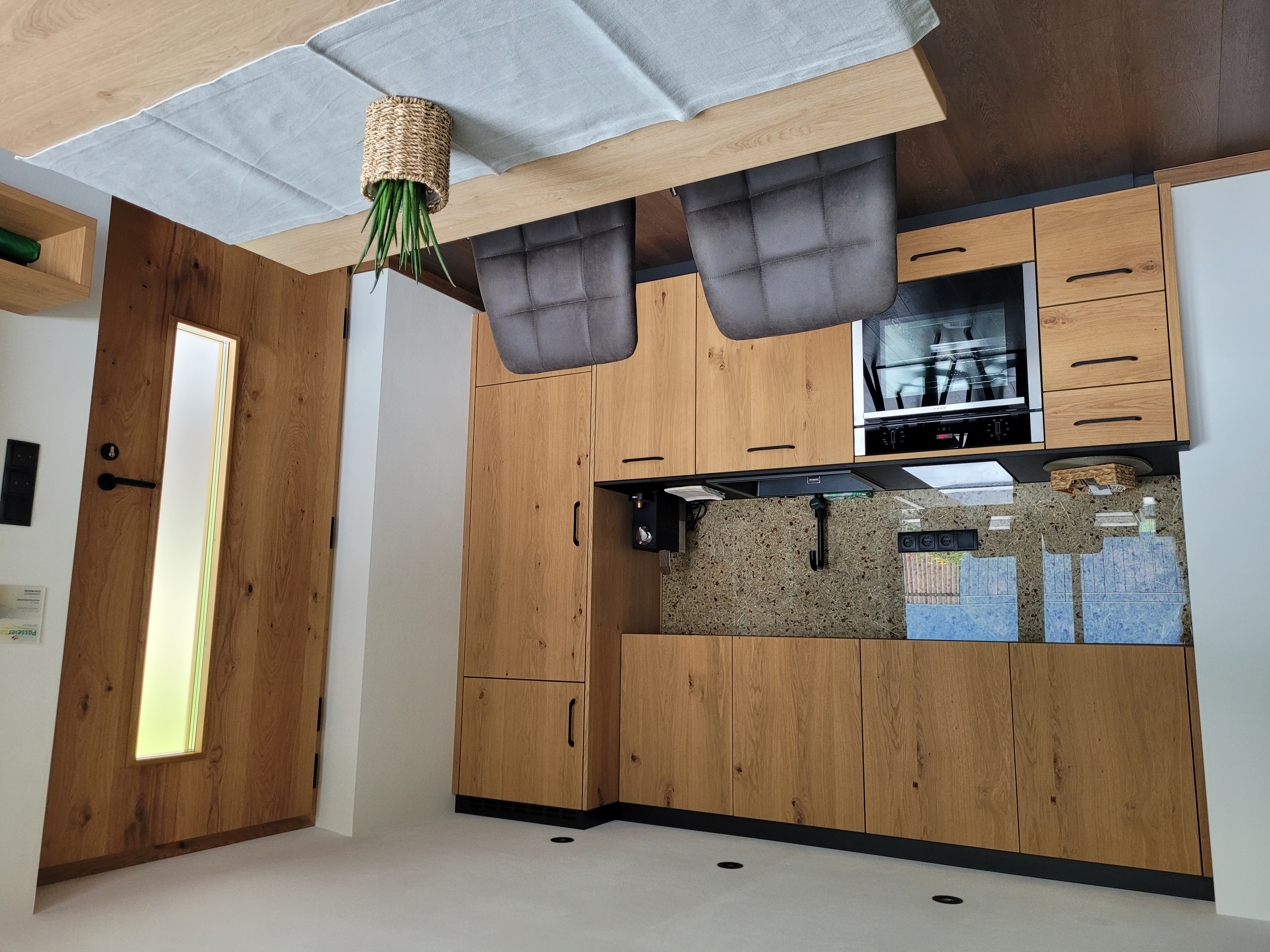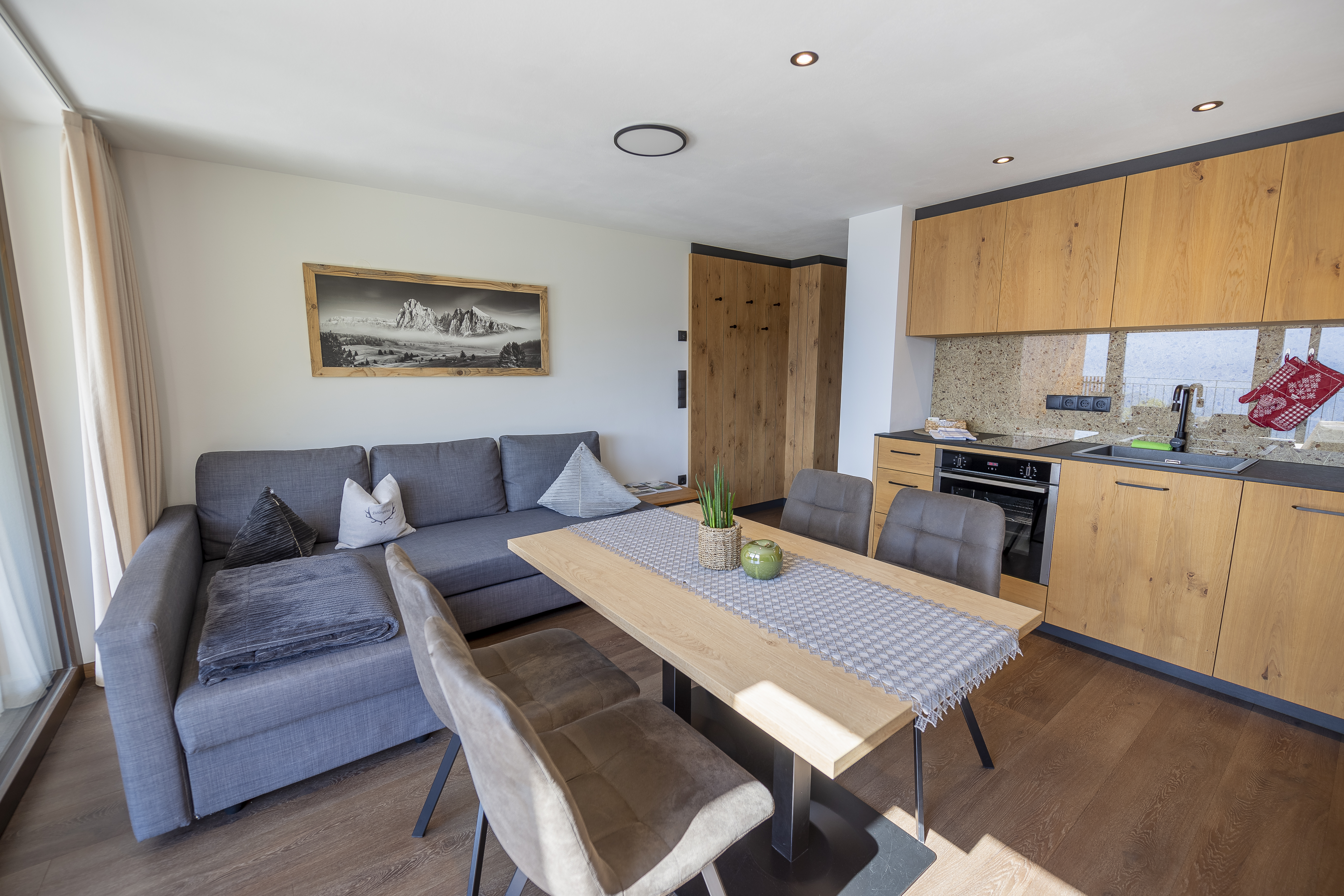 Das Apartment „Alps“ liegt in der Mitte des Hauses. Hier gibt es auf 38 qm eine Wohnküche mit großen Panoramafenstern, moderner Einbauküche und Schlaf-Couch, ein Schlafzimmer (13 qm), sowie ein Bad.