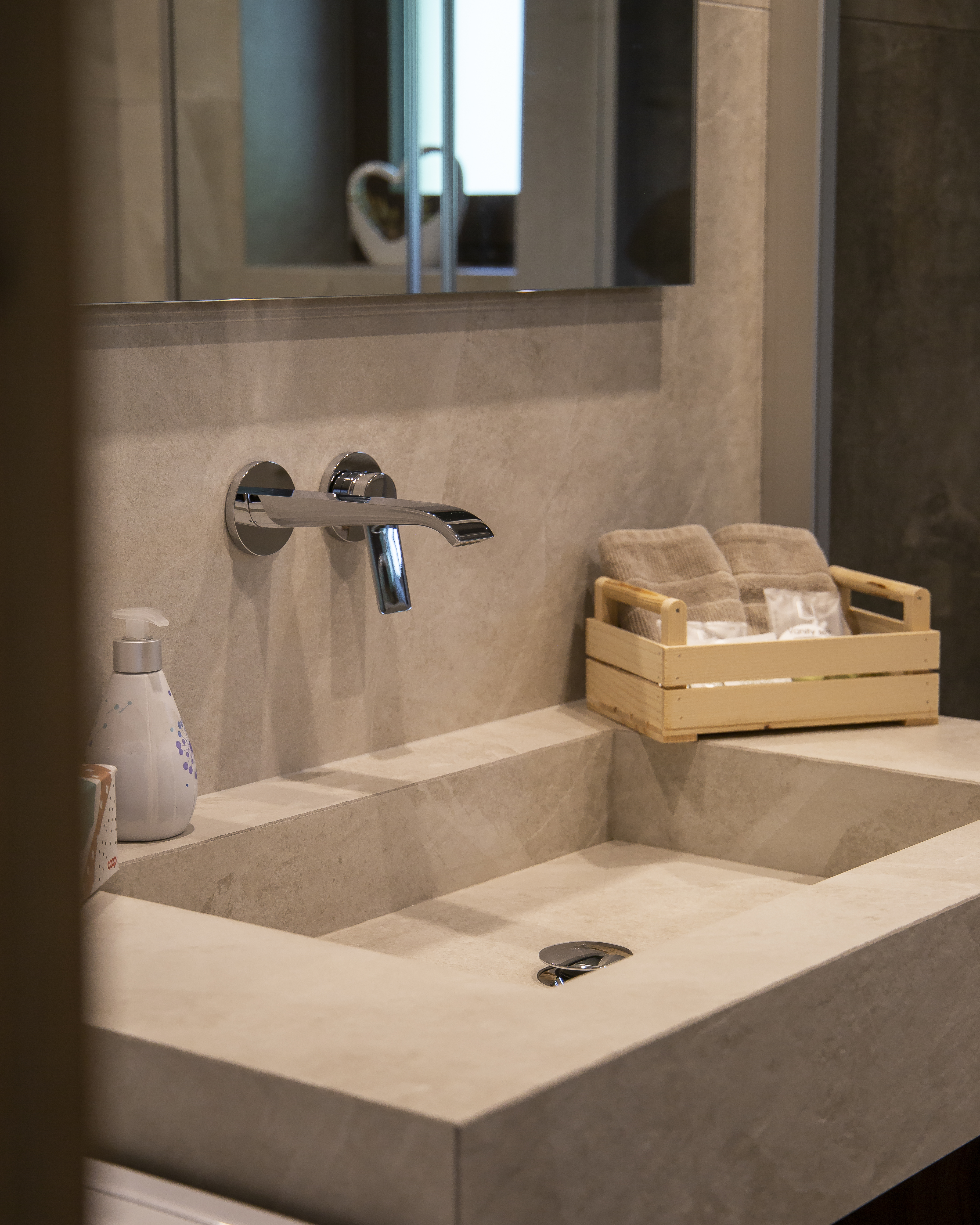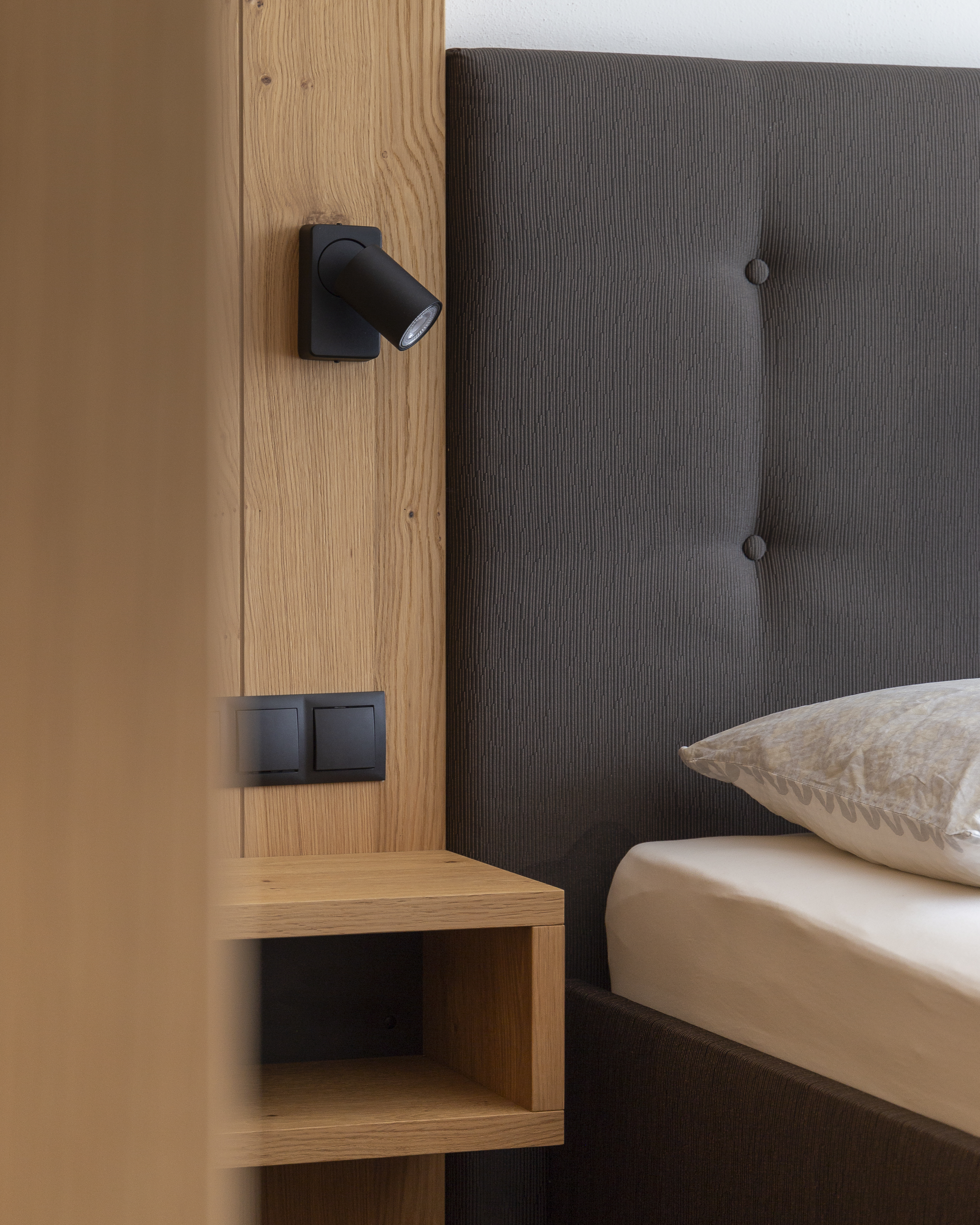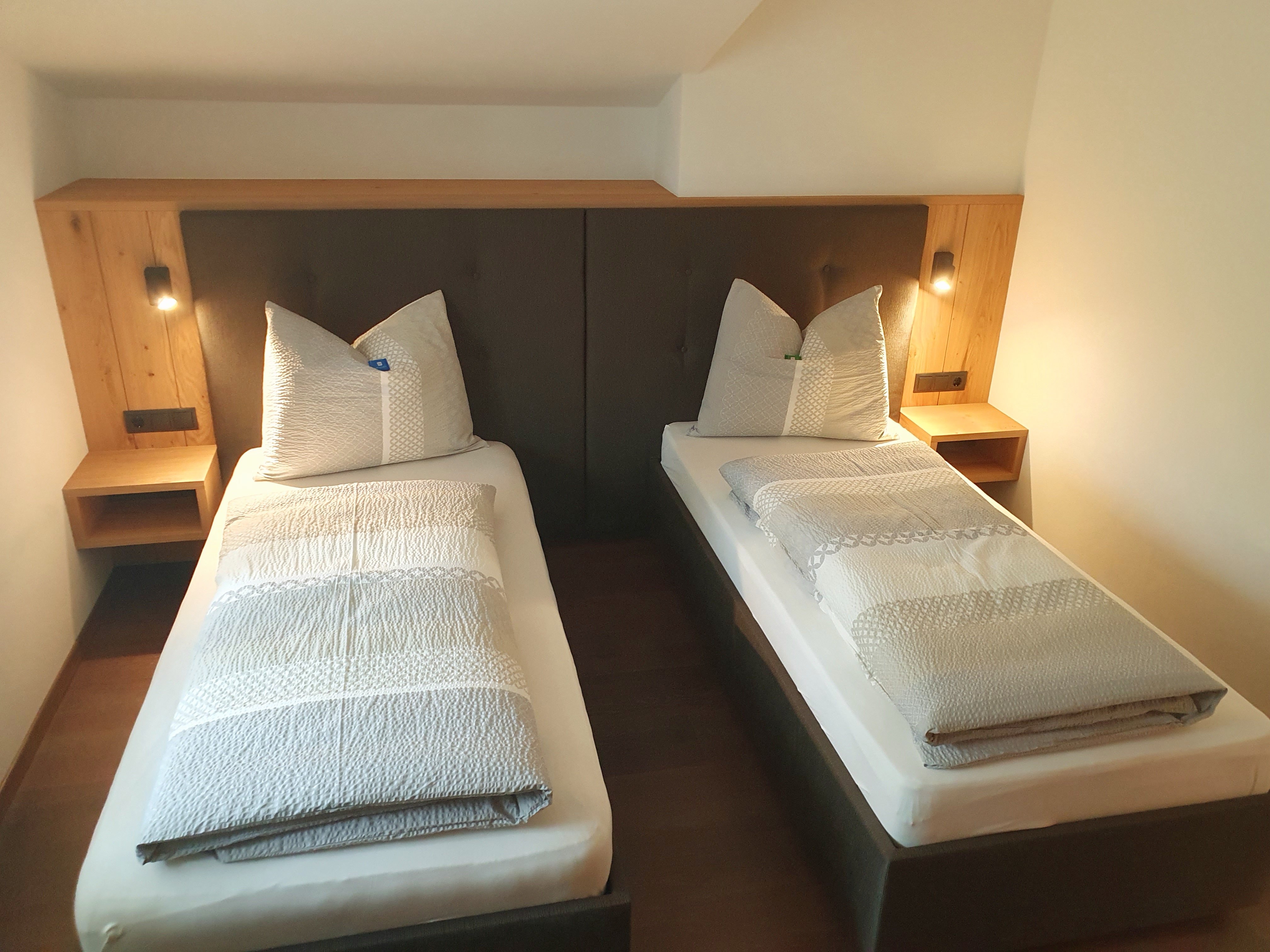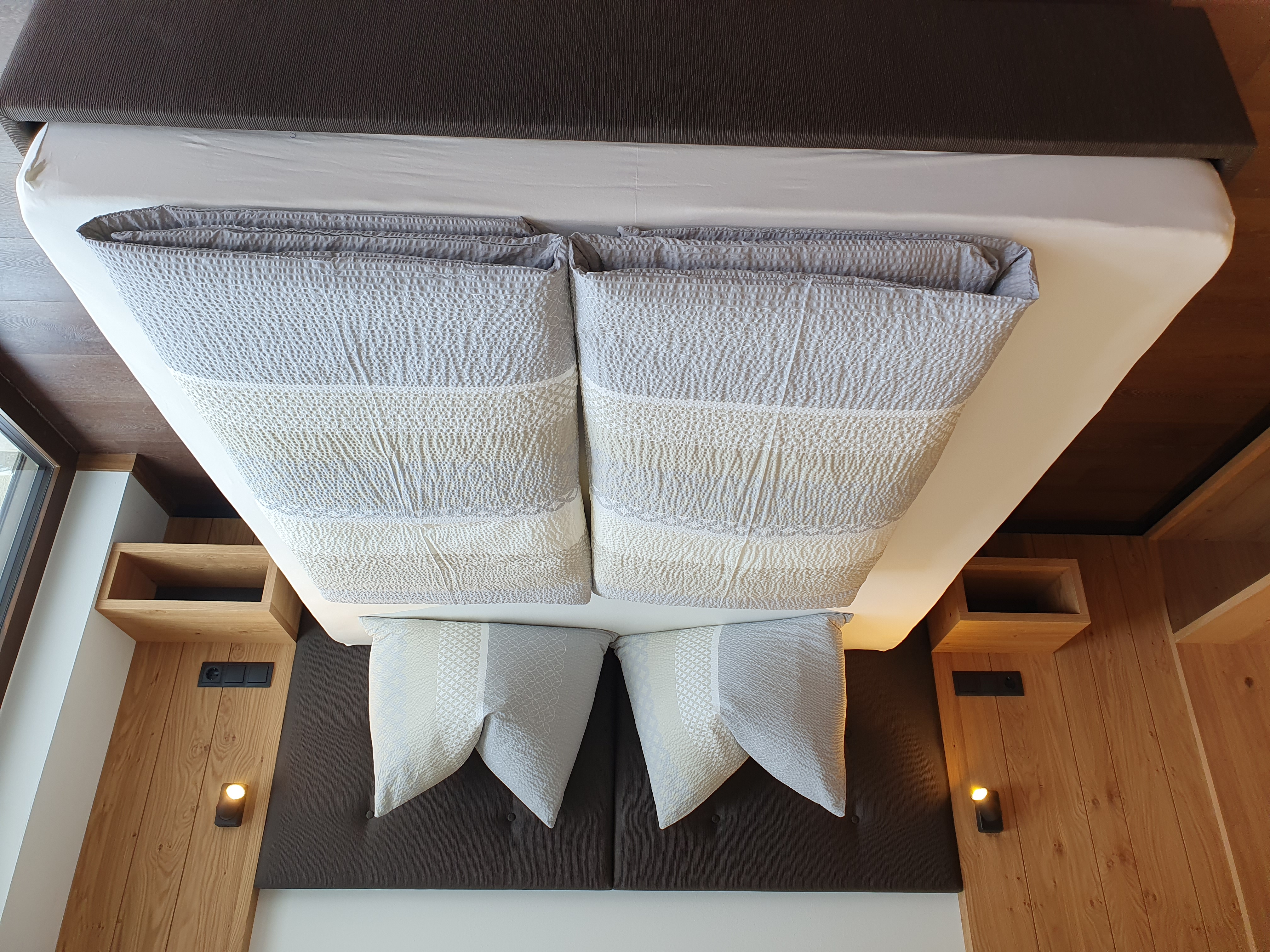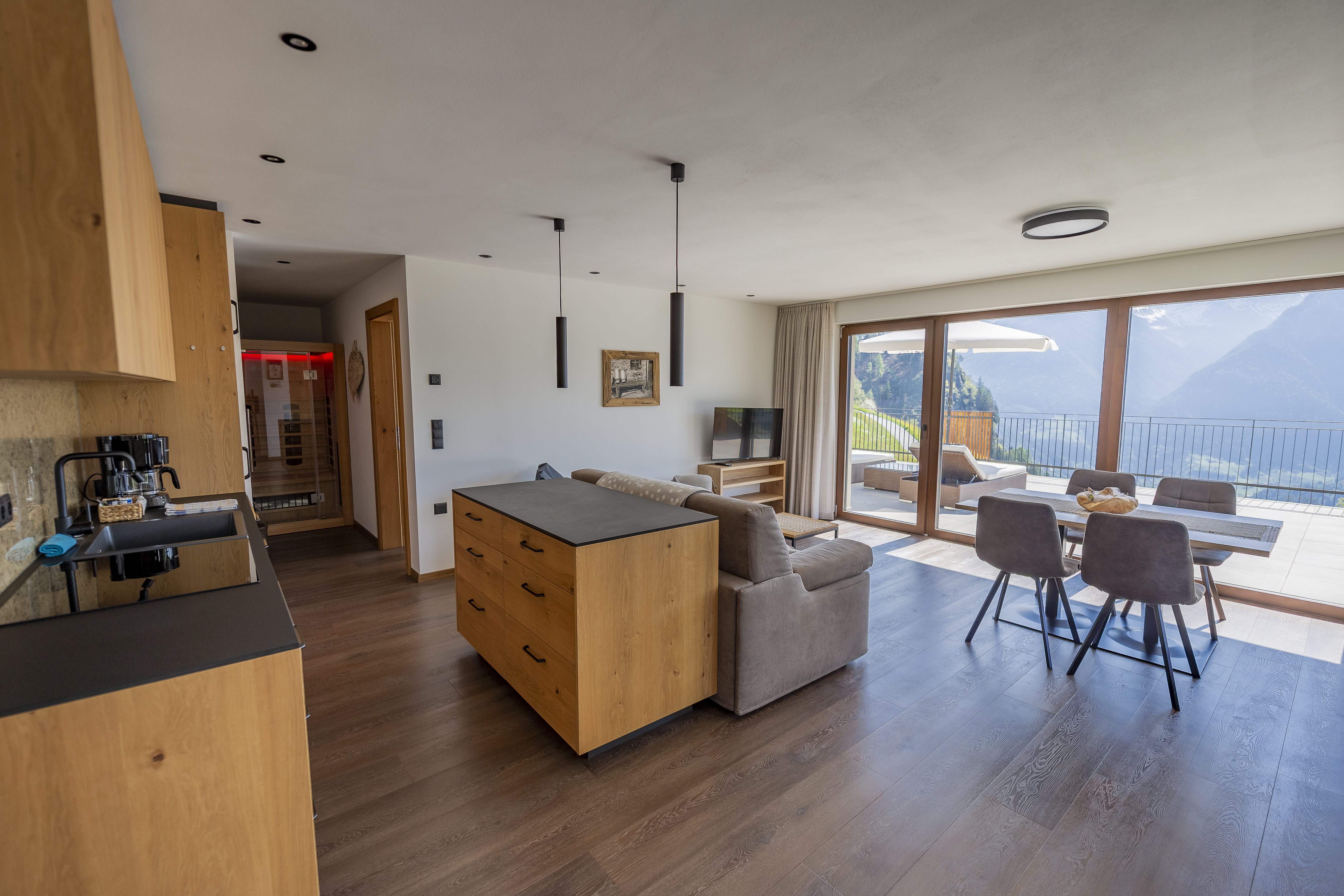 Das Apartment „Mountainsuite“ umfasst die gesamte Etage unter dem Dach. Auf 77 qm finden Sie einen großen Living Room (30 qm) mit Panoramafenstern, moderner Einbauküche und Infrarot-Sauna, zwei Schlafzimmer (je 13,5 qm), ein geräumiges Bad und ein Tages WC mit Bidet. Die gesamte Wohnung ist mit Fußbodenheizung ausgestattet, das Haus ist als Klimahaus zertifiziert. Auf der Panoramaterrasse (23 qm) gibt es eine Infrarot-Sauna sowie einen Whirlpool für zwei Personen.