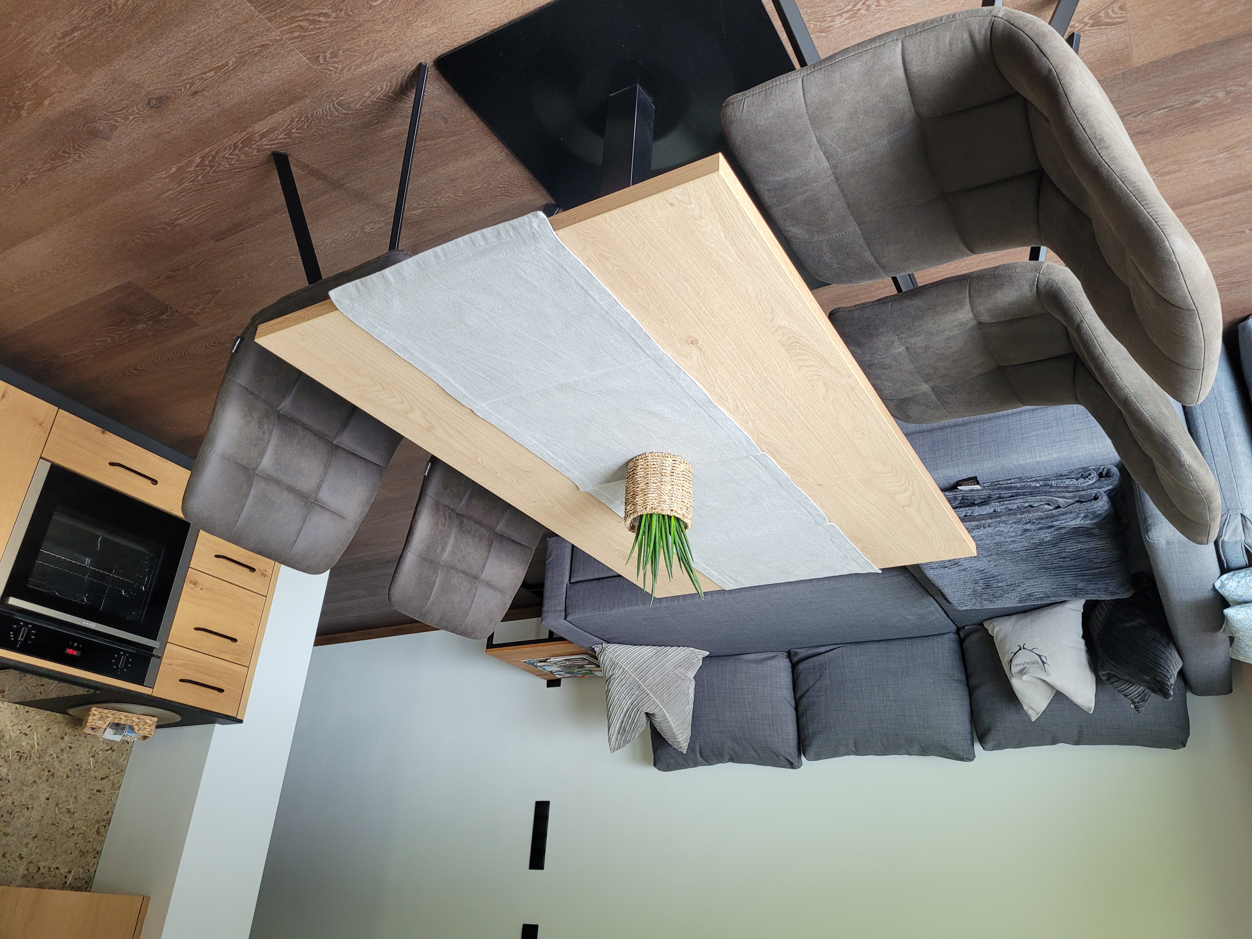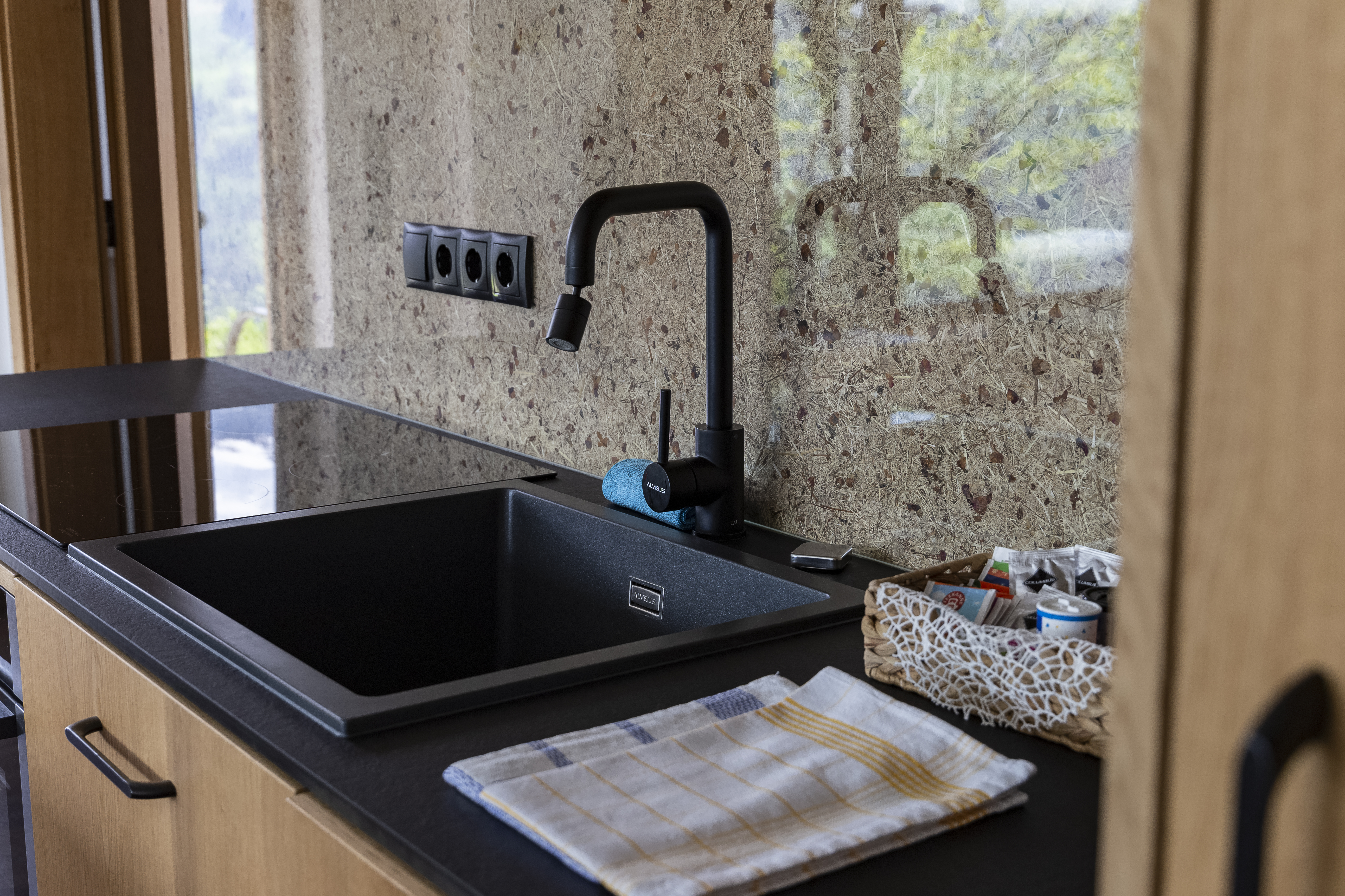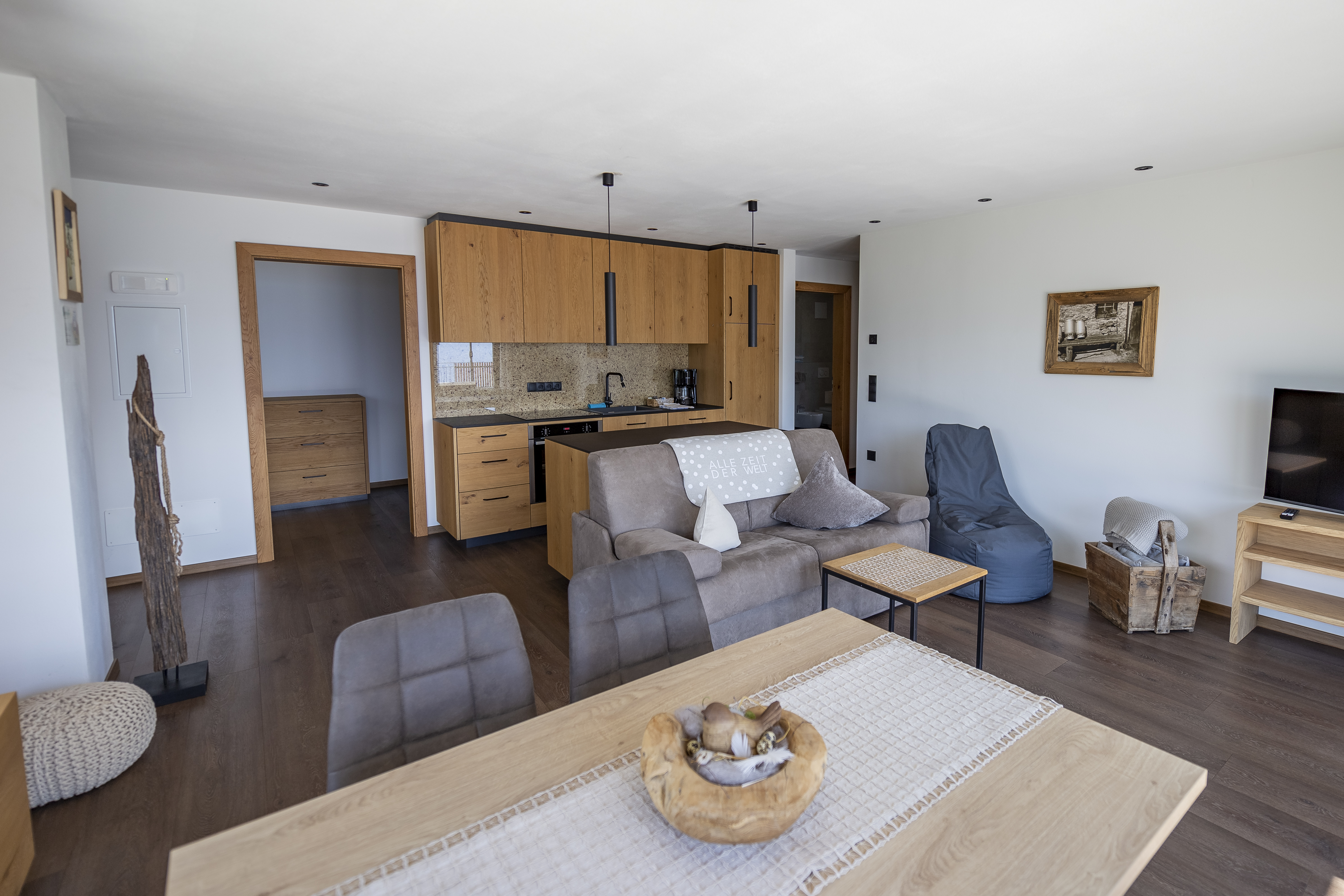 Die Wohnung besteht aus einem großen Wohnzimmer mit Panoramablick auf die Berge, ist ausgestattet mit einer modernen Einbauküche und Couch, einem Schlafzimmer (14 qm), einem Kinderzimmer mit zwei Betten (Stockbett 200×140cm und 200×80cm) sowie einem geräumigem Bad mit Fenster, Bidet und Waschmaschine. Handtücher sind vorhanden.