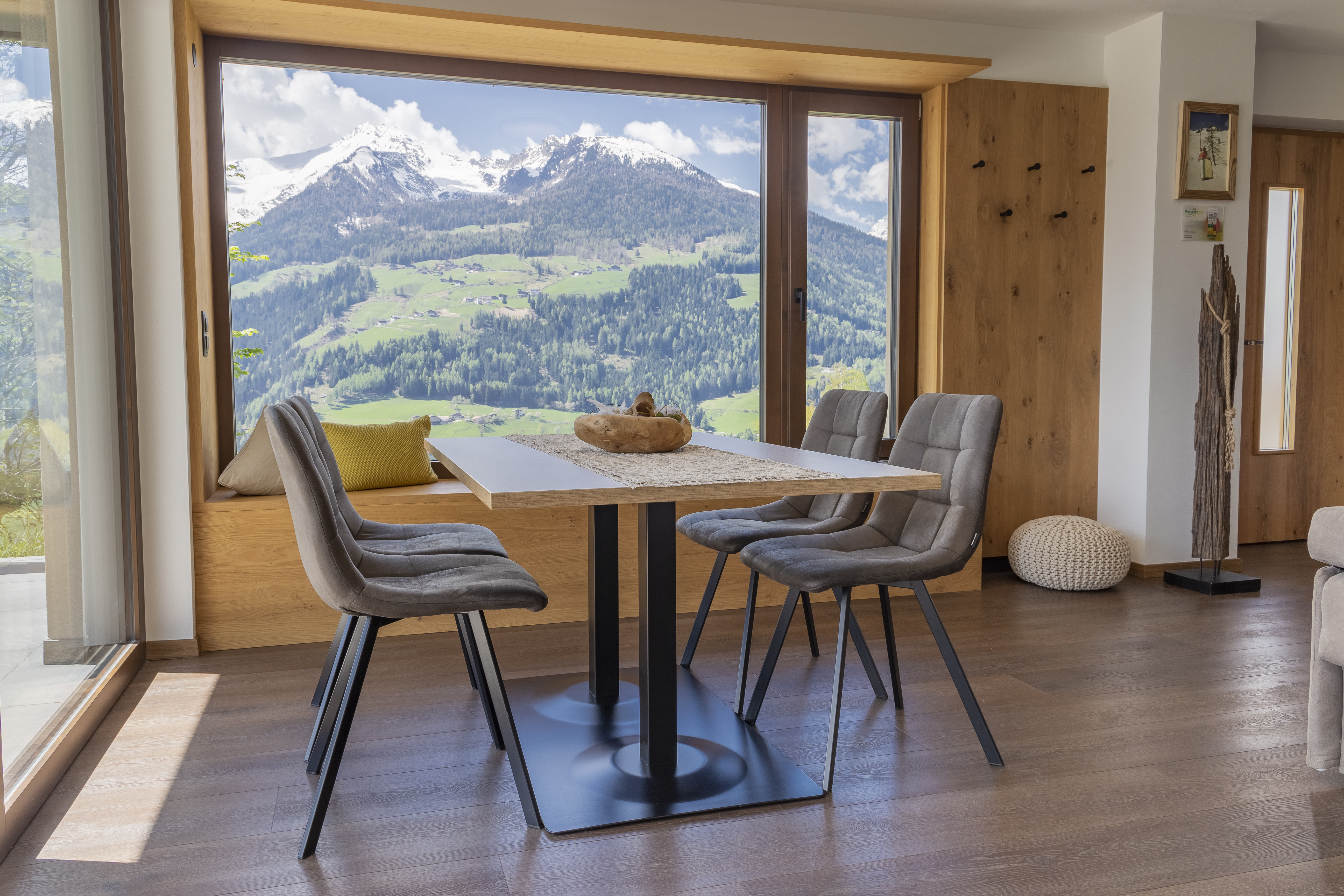 Das Appartement bietet nicht nur einen zeitgemäßen Wohnkomfort, sondern auch einen unvergleichlichen Blick auf die majestätischen Gipfel und grünen Bergwiesen, die unsere Alleinlage umgeben. Die großzügigen Panoramafenster lassen das Tageslicht hereinströmen und eröffnen Ihnen atemberaubende Ausblicke auf die umliegende Landschaft, die sich von saftigen Tälern bis hin zu fernen Gipfeln erstreckt